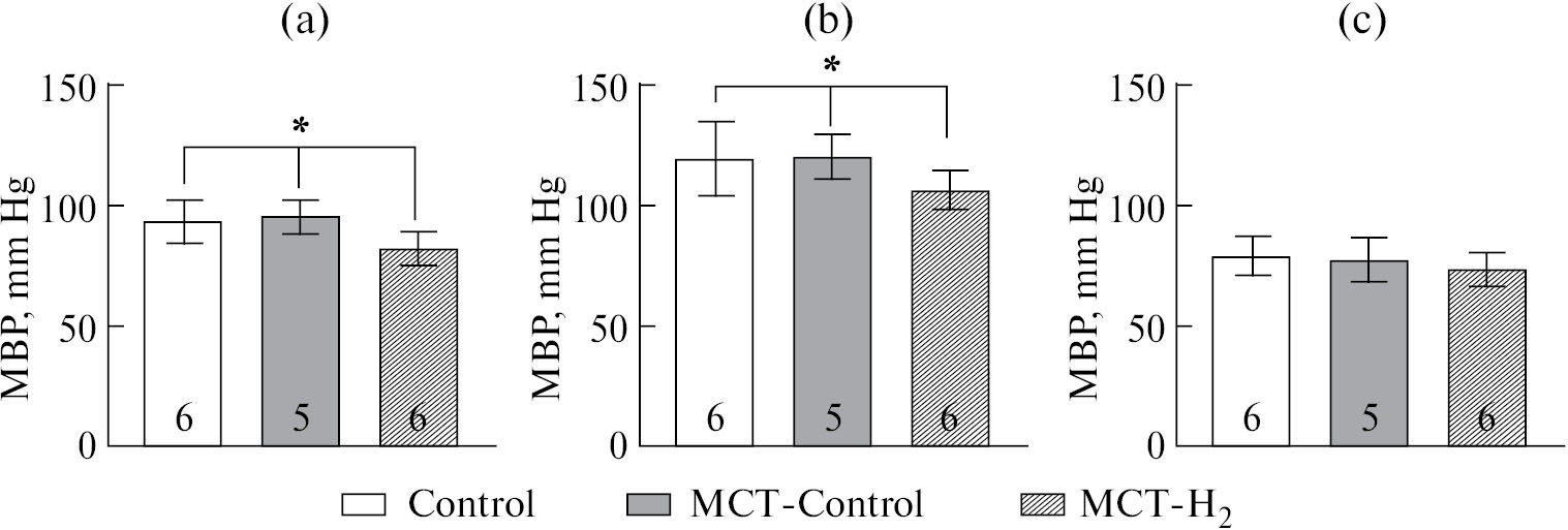 Рис. 2. Среднее артериальное давление (а), систолическое (b) и диастолическое (c) артериальное давление на 21-й день эксперимента. *MCT-H2 vs Control, MCT-Control, p < 0.05, One-way ANOVA. Цифры внутри столбиков обозначают количество животных.