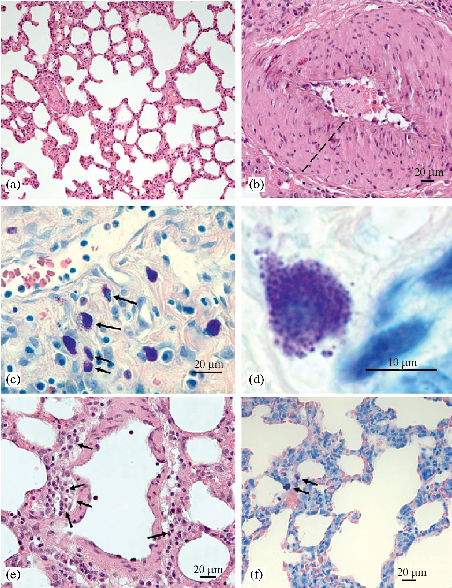 Рис. 3. Морфологические особенности структур легких и тучных клеток крыс линии Вистар при моделировании легочной гипертонии. Методы окрашивания: (a), (b), (e) – гематоксилин и эозин, (c), (d), (f) – раствор Гимзы. (a) – группа контроля, (b, c, d) – МКТ-Контроль, (e, f) – МКТ-Н2. (a) – в респираторном отделе легкого удлиненные альвеолярные проходы переходят в тонкостенные альвеолы, признаков воспалительного инфильтрата и отека стромы не наблюдается; (b) – выявляются структурные и функциональные изменения в артериальной стенке и облитерации просвета с гипертрофией медии; (c) – тучные клетки (фиолетовое окрашивание) инфильтрируют строму легочной ткани, активно дегранулируют; (d) – в локусе отмечаются нейтрофилы и плазмоциты; (e) – менее выраженный отек интерстициальных структур и альвеолоцитов легкого, периваскулярно расположено незначительное количество клеток воспалительного инфильтрата; (f) – единичные тучные клетки в поле зрения без признаков дегрануляции. Увеличение (a) – х 200, (b, c, e, f) – х 400, (d) – х 1000.