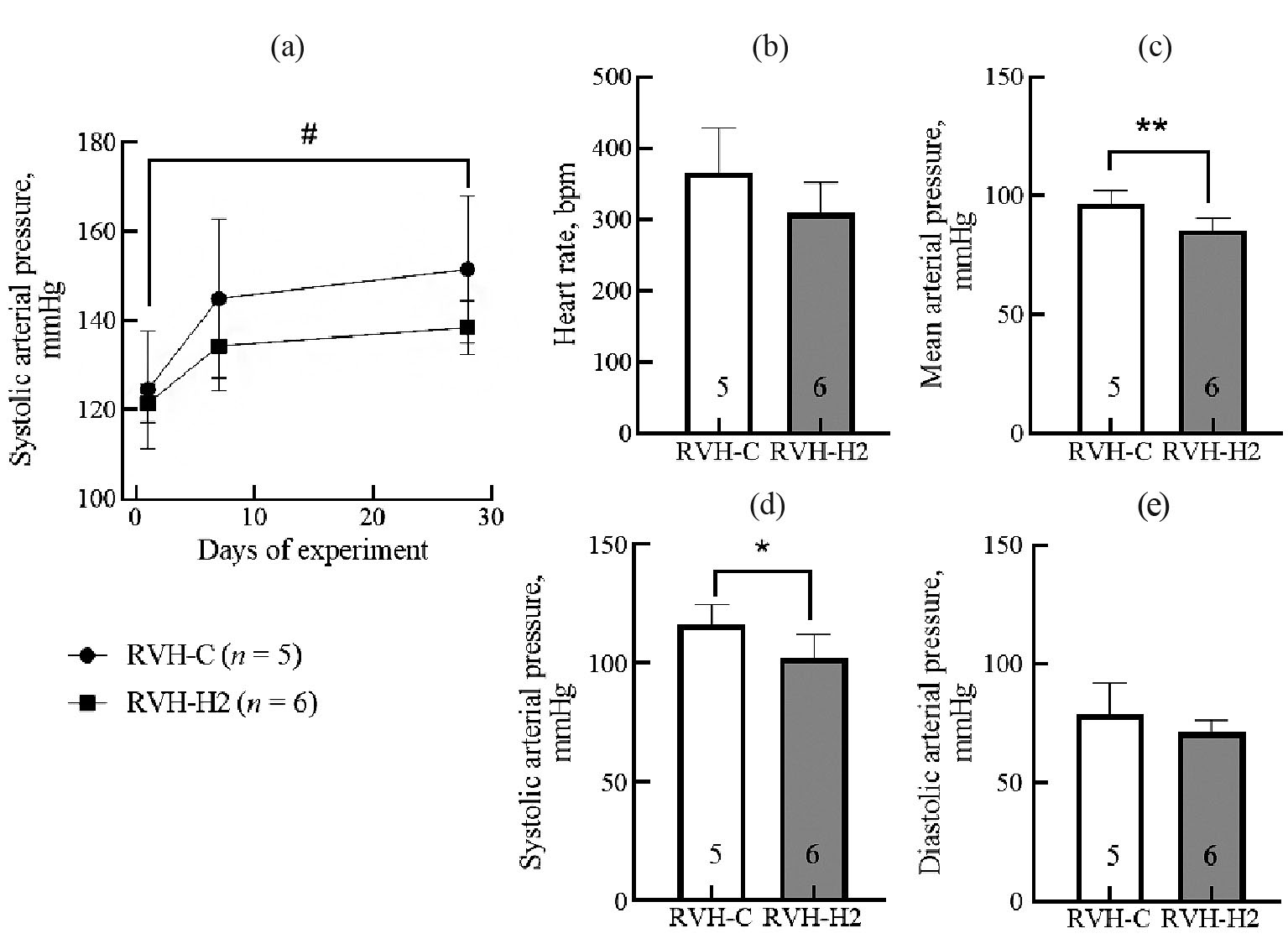 Рис. 5. Параметры гемодинамики бодрствующих (а) и наркотизированных (b – d) крыс линии Wistar с реноваскулярной почечной гипертонией 1П1К. (a) – динамика САД у бодрствующих крыс, измеренная непрямым плетизмографическим методом. (b – d) гемодинамические показатели у наркотизированных крыс – (b) ЧСС; (с) – cр. АД; (d) – CАД; (e) – ДАД. # - статистически значимые различия между 1 и 3 точками (p < 0.05) two-way ANOVA. * – статистически значимые различия между группами (p < 0.05) по t-тесту для несвязанных переменных. ** – статистически значимые различия между группами (p < 0.01) по t-тесту для несвязанных переменных. Цифры внутри столбиков обозначают количество животных.