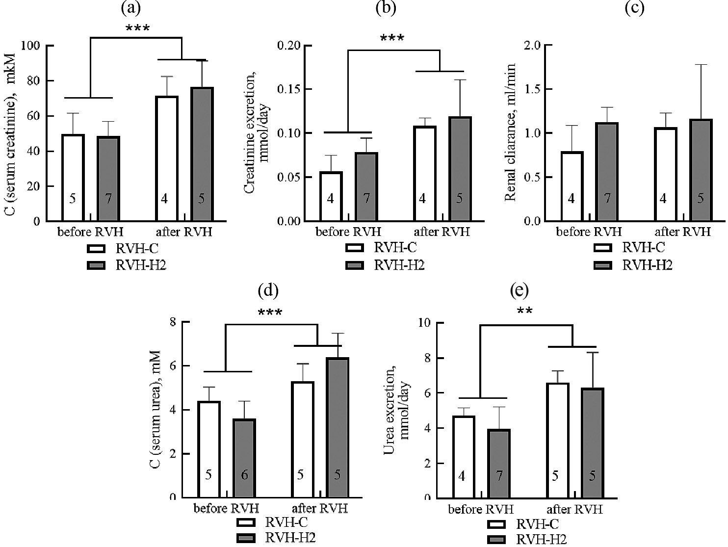 Рис. 6. Оценка выделительной функции почки у крыс линии Wistar с РВГ. (a) – концентрация креатинина в сыворотке крови; (b) – суточная экскреция креатинина; (с) – клиренс креатинина; (d) – концентрация мочевины в сыворотке крови; (e) – суточная экскреция мочевины. ** – статистически значимые различия между значениями до и после операции (p < 0.01) по two-way ANOVA. *** – статистически значимые различия между значениями до и после операции (p < 0.001) по two-way ANOVA. Цифры внутри столбиков обозначают количество животных.