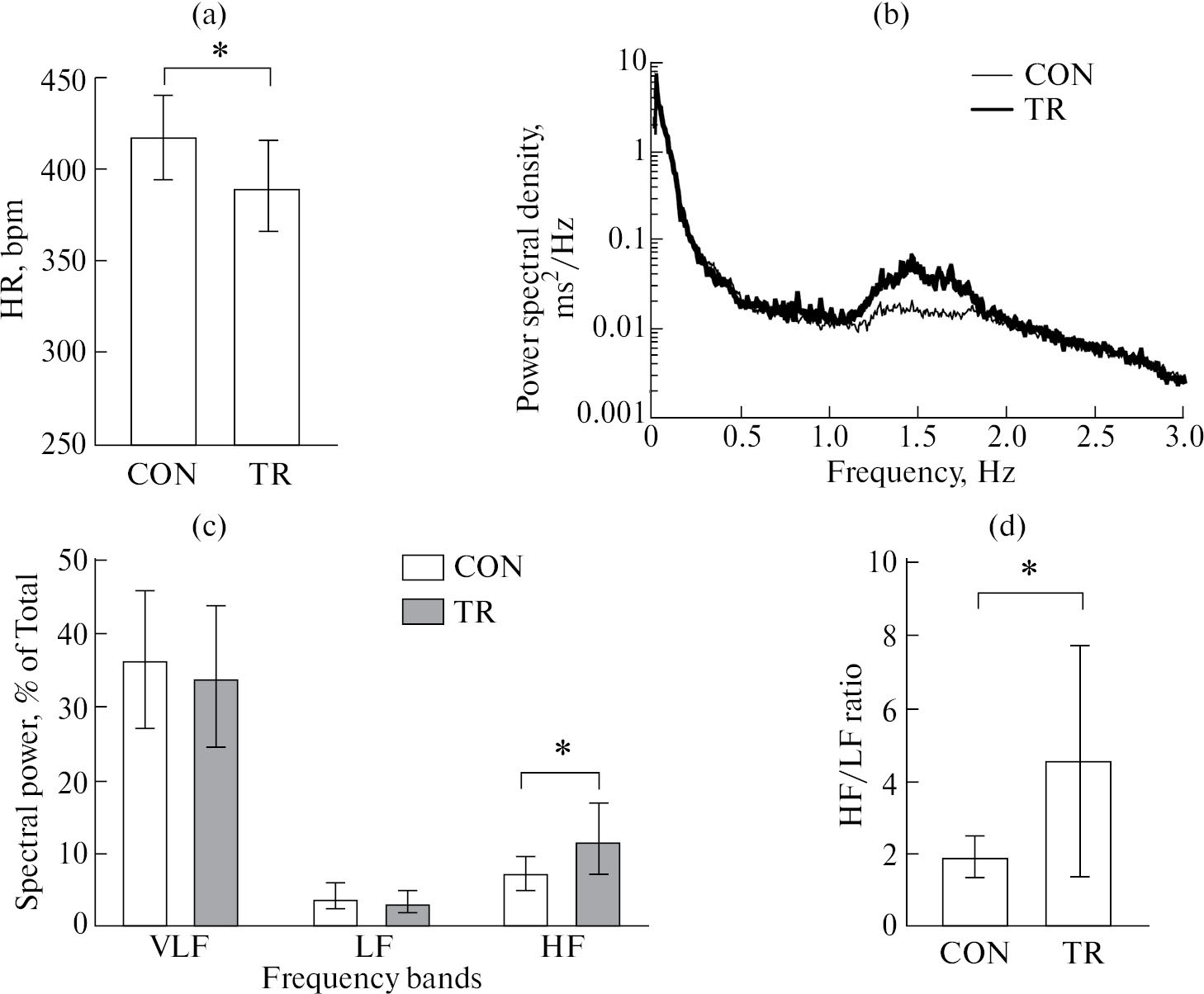 Рис. 2. Значения ЧСС и показателей спонтанной вариабельности сердечного ритма в спокойном состоянии у контрольной группы крыс (CON, n = 12) и тренированной группы крыс (TR, n = 11). На рисунках приведены результаты анализа записей ЭКГ длительностью 30–60 мин: значения ЧСС (a), спектры мощности RR-интервала (каждая линия – результат усреднения спектров мощности для всех крыс в группе) (b), значения мощности спектра в трех частотных диапазонах (c) и отношение значений мощности высокочастотных и низкочастотных колебаний (d). Частотные диапазоны: VLF – очень низкочастотный (0.05–0.25 Гц), LF – низкочастотный (0.25–0.6 Гц), HF – высокочастотный (0.75–3 Гц). Данные представлены в виде среднего и стандартного отклонения. *p < 0.05 (непарный критерий Стьюдента).