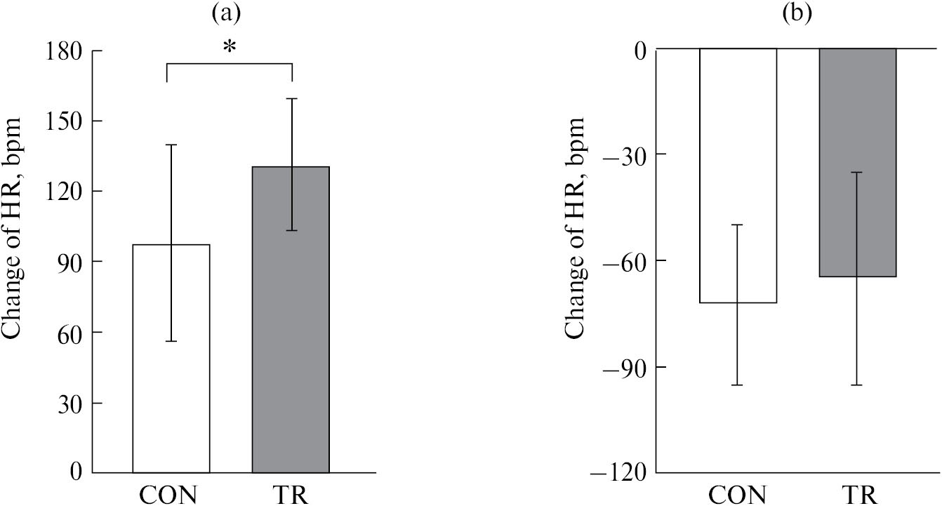 Стрессирование животных путем подачи струи воздуха (air-jet stress) приводило к выраженному повышению ЧСС (рис. 3a). Во время 4-минутного интервала времени, предшествовавшего стрессу, ЧСС в группе TR была ниже, чем в группе CON (370 ± 27 уд/мин по сравнению с 398 ± 28 уд/мин, p < 0.05 по непарному критерию Стьюдента), тогда как во время 4-минутного стресса различий между группами не наблюдалось (459 ± 77 уд/мин и 466 ± 54 уд/мин, p > 0.05 по непарному критерию Стьюдента). Таким образом, повышение ЧСС в ответ на стрессирующее воздействие у тренированных крыс было более выраженным, чем в контроле (рис. 3b).