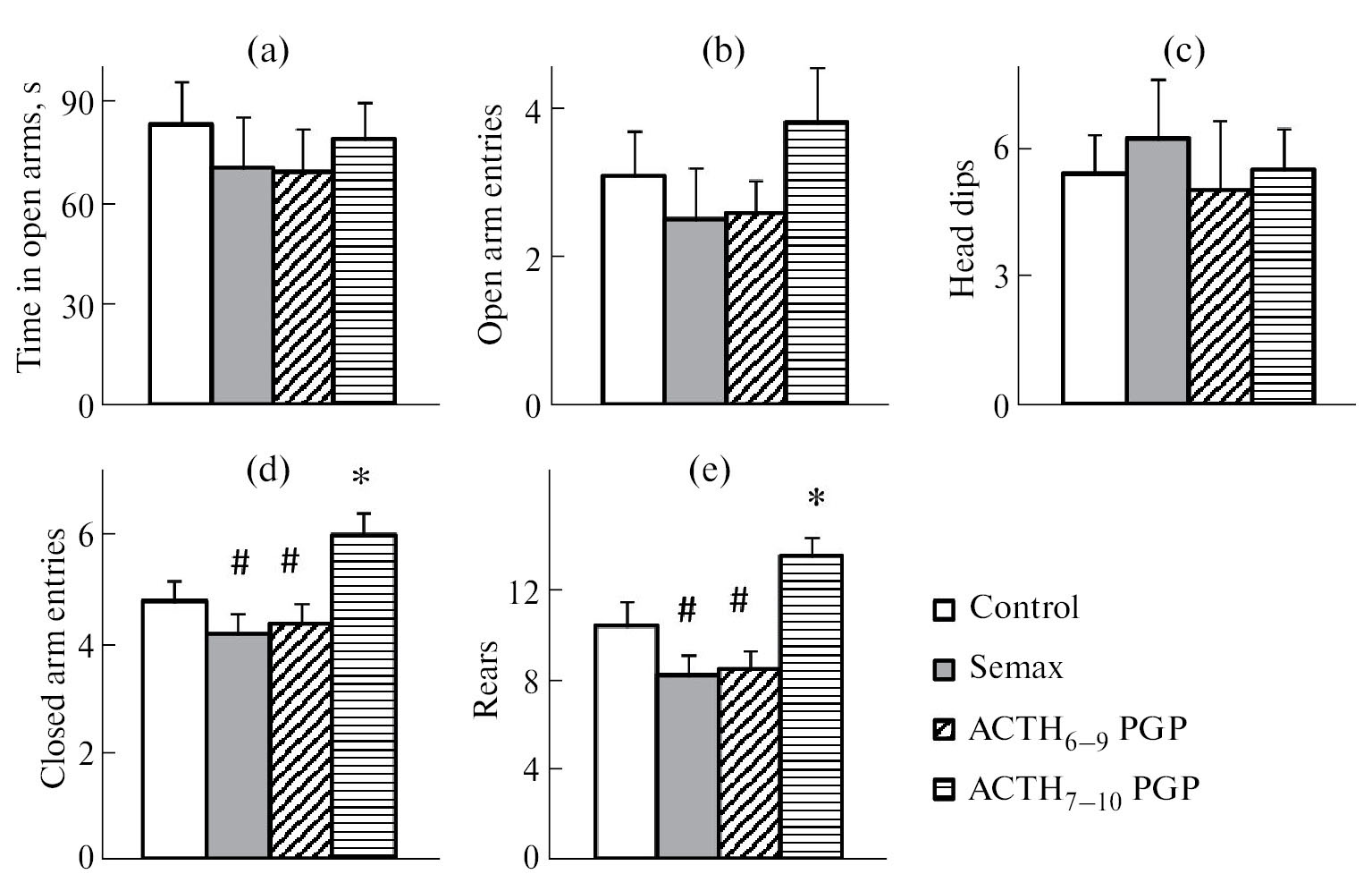 Рис. 3. Влияние семакса, АКТГ6-9PGP и АКТГ7-10PGP на поведение крыс в тесте “Приподнятый крестообразный лабиринт” при однородном слабом освещении рукавов лабиринта. (a) – время, проведенное в открытых рукавах лабиринта – секунды; (b) – число заходов в открытые рукава; (c) – число свешиваний; (d) – число заходов в закрытые рукава; (e) – число стоек. Пептиды вводили интраназально в дозе 0.05 мг/кг за 15 мин до тестирования. В каждой группе было по 10 крыс. Данные представлены в виде среднего ± стандартная ошибка среднего. Статистически значимые отличия от контроля отмечены * (p < 0.05), от группы с введением АКТГ7-10PGP – # (p < 0.05) и ## (p < 0.01).