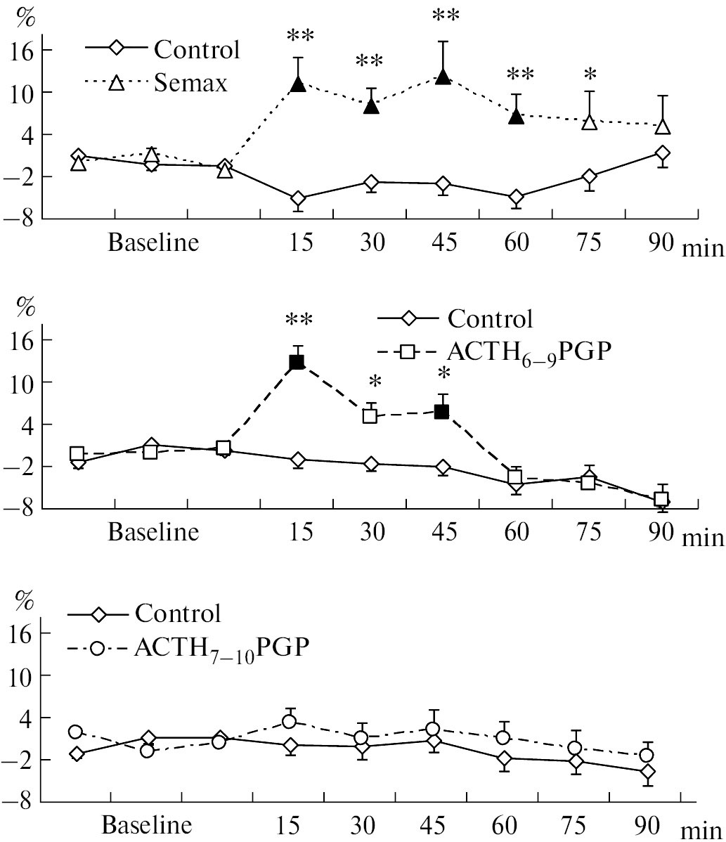 Оценка влияния исследуемых препаратов на эмоциональное состояние животных показала, что семакс и АКТГ6-9PGP не влияют на поведение крыс в условиях незначительной стрессорной нагрузки, однако в условиях, провоцирующих реакцию тревоги и страха, оказывают анксиолитическое действие. Введение АКТГ7-10PGP также приводило к снижению тревожности животных в стрессогенных условиях. Однако этот пептид, в отличие от семакса и АКТГ6-9PGP, стимулировал исследовательскую активность крыс в условиях незначительной стрессорной нагрузки.