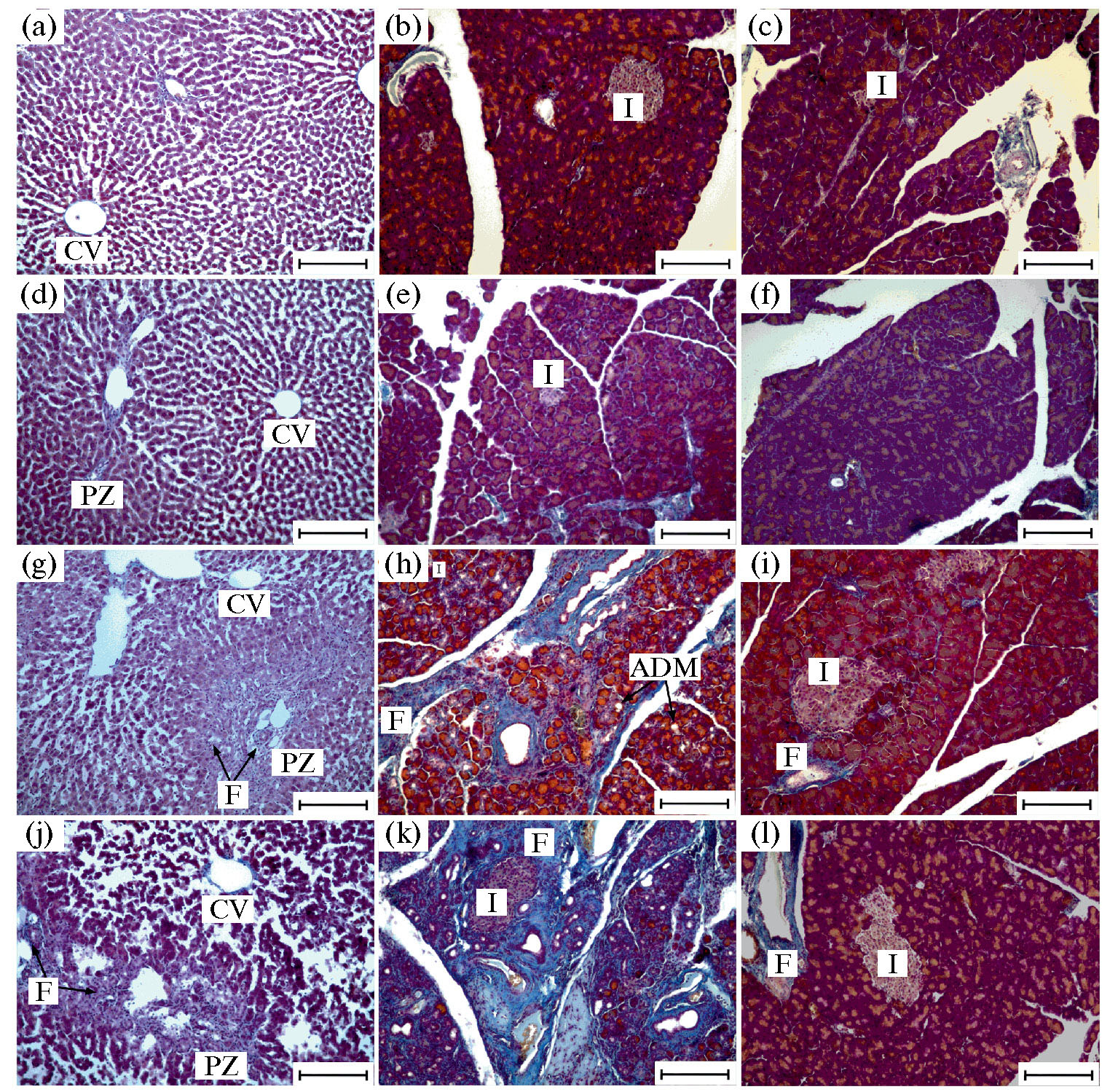 Рис. 1. Гистологическое окрашивание по Маллори ткани печени, селезеночного и кишечного отделов поджелудочной железы самок крыс всех экспериментальных групп, увеличение х10, шкала – 100 мкм. Группа (К): (a) – печень, (b) – селезеночный отдел ПЖ, (c) – кишечный отдел ПЖ; группа (ГиперПрл): (d) – печень, (e) – селезеночный отдел ПЖ, (f) – кишечный отдел ПЖ; группа (БП): (g) – печень, (h) – селезеночный отдел ПЖ, (i) – кишечный отдел ПЖ; группа (БПгиперПрл): (j) – печень, (k) – селезеночный отдел ПЖ, (l) – кишечный отдел ПЖ. ADM – ацинарно-протоковая метаплазия, CV – центральная вена печеночной дольки, F – фиброз, I – островок Лангерганса ПЖ, PZ – портальная зона печеночной дольки.