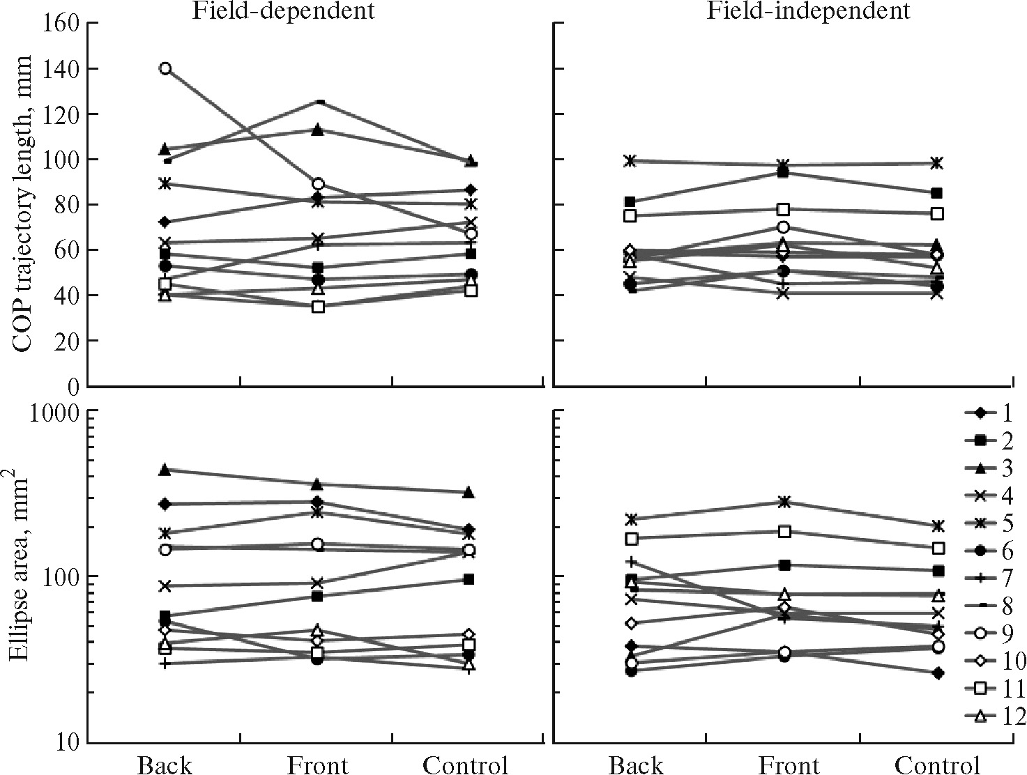 Рис. 2. Индивидуальные показатели положения центра давления тела–длина траектории по сагиттальной оси (вверху) и площадь доверительного эллипса (внизу) в группах полезависимых (n = 12) и поленезависимых (n = 12) испытуемых в восьмисекундном периоде, предшествующем звуковой стимуляции.