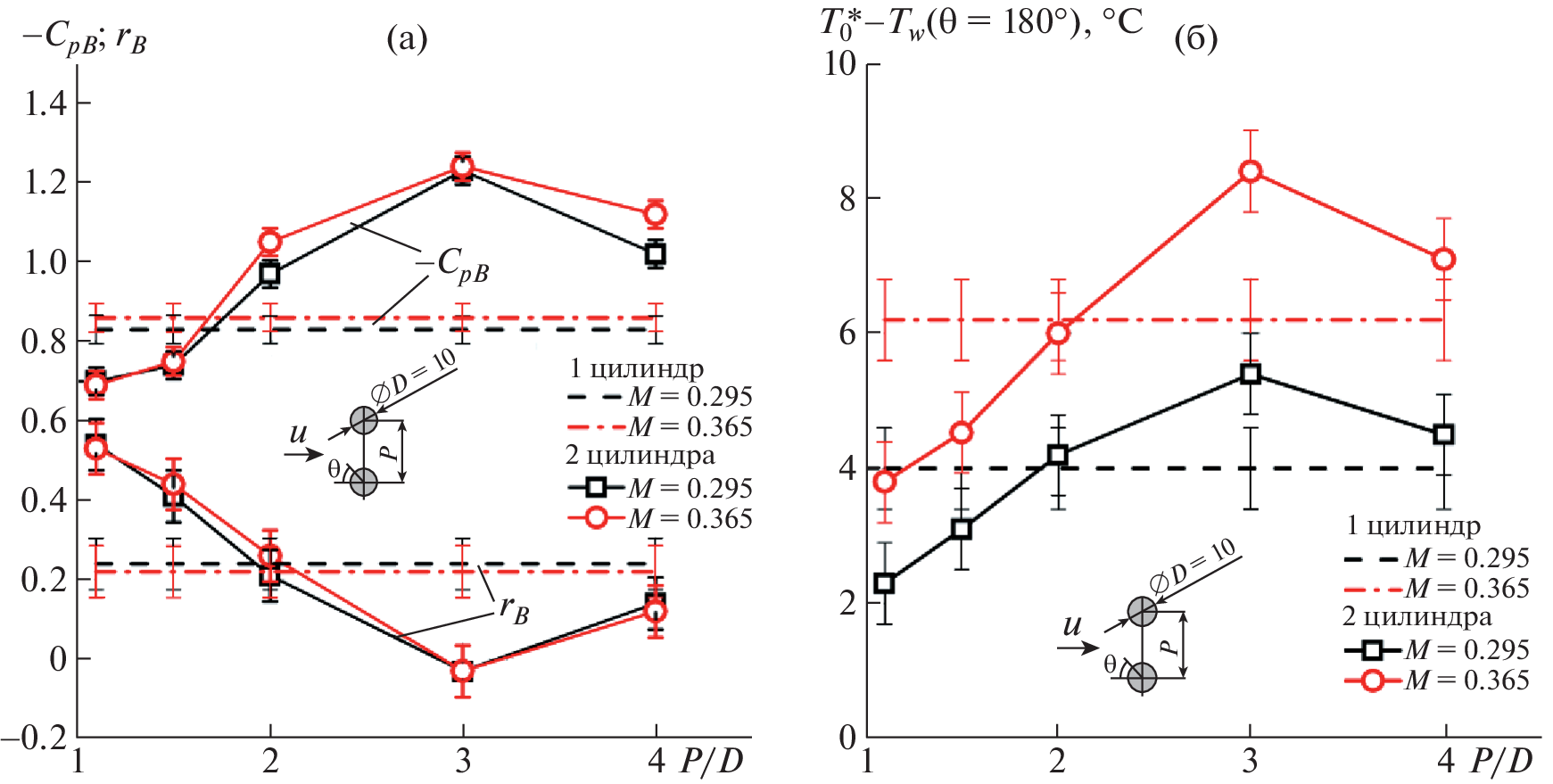 The influence of the distance between two circular side-by-side cylinders in a cross flow on the surface distribution of temperature and static pressure is experimentally studied. The studies were carried out at free-stream Mach numbers M equal to 0.295 and 0.365 and Reynolds numbers ReD equal to 6.4 × 104 and 7.9 × 104, respectively. The surface distributions of the pressure coefficient and the temperature recovery factor for one of the cylinders are obtained. It is shown that, depending on the distance between the cylinders, the pressure coefficient and temperature recovery factor can be both higher and lower than the values obtained in the flow over a single cylinder with the same free-stream parameters.