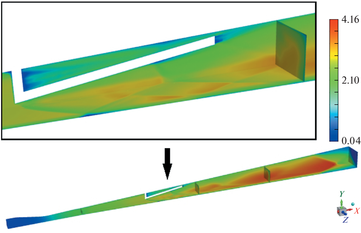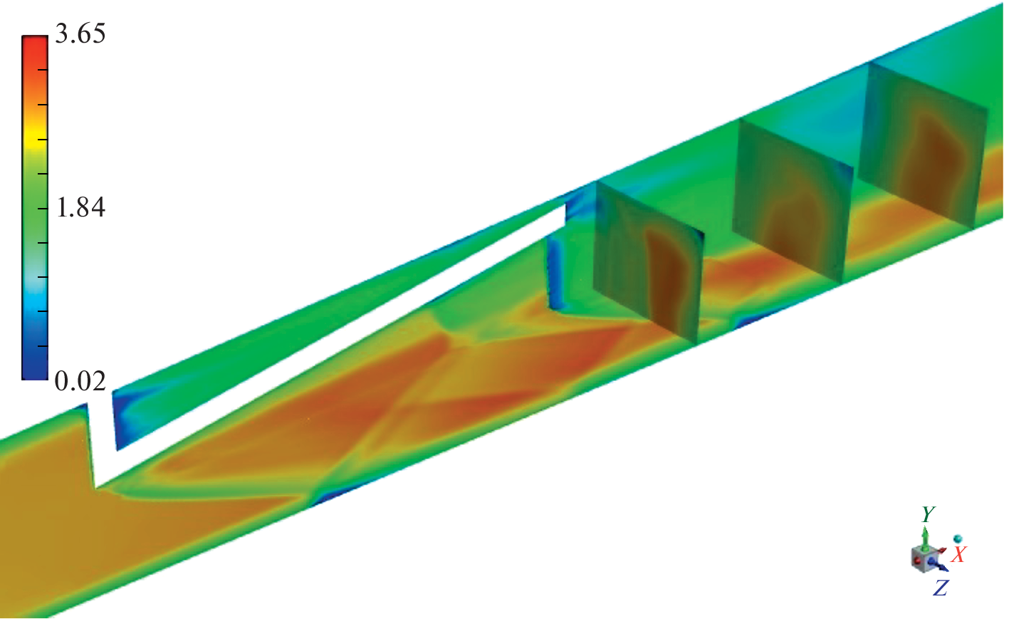 Steady supersonic air flow in a diverging aerodynamic channel of rectangular cross-section is numerically simulated. The channel represents a laboratory model of an air-breathing straight-flow engine. The aerodynamic model is validated using the experimental data for the case in which the zone of volumetric heat release is absent. After the model has been validated a supersonic flow with a built-in zone of volumetric heat release was numerically simulated. Three-dimensional distributions of the velocity, temperature, and pressure in a steady supersonic air flow are obtained. It is shown that in the case, in which the volumetric density of the heat power of the source is equivalent to the mean total power of the discharge W = 10 kW, the discharge heats the gas up to the temperature T = 1700 to 4200 K, which leads to flow acceleration without its thermal choking. When the thermal power density of the source is equivalent to the mean common discharge power W = 20 kW, the gas is heated more strongly, up to 6700 K, but then local thermal choking of the flow occurs.