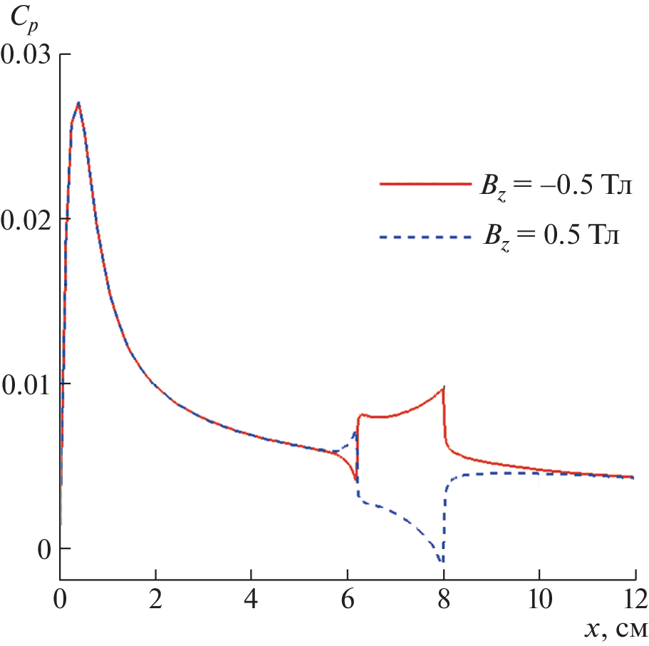 The electrodynamic structure of an anomalous glow discharge between two plane electrodes located on the surface of a sharp plate in supersonic flow of molecular nitrogen is studied numerically in a wide range of Mach numbers using a modified ambipolar model of quasi-neutral electric-discharge plasma. The ambipolar diffusion coefficient and the effective ionization rate are modified while taking into account the external magnetic field. The problem is solved in the two-dimensional x–y formulation, when the external magnetic field strength is directed in the positive or negative direction of the z axis. The parameters of anomalous glow discharge are numerically studied in the pressure range p = 0.14–5 Torr and the voltage drops on the quasineutral current column of discharge plasma V = 30–320 V. The main problem parameters which make it possible to obtain a reasonable agreement with the available experimental data are determined.