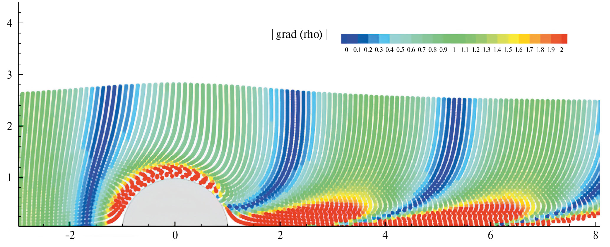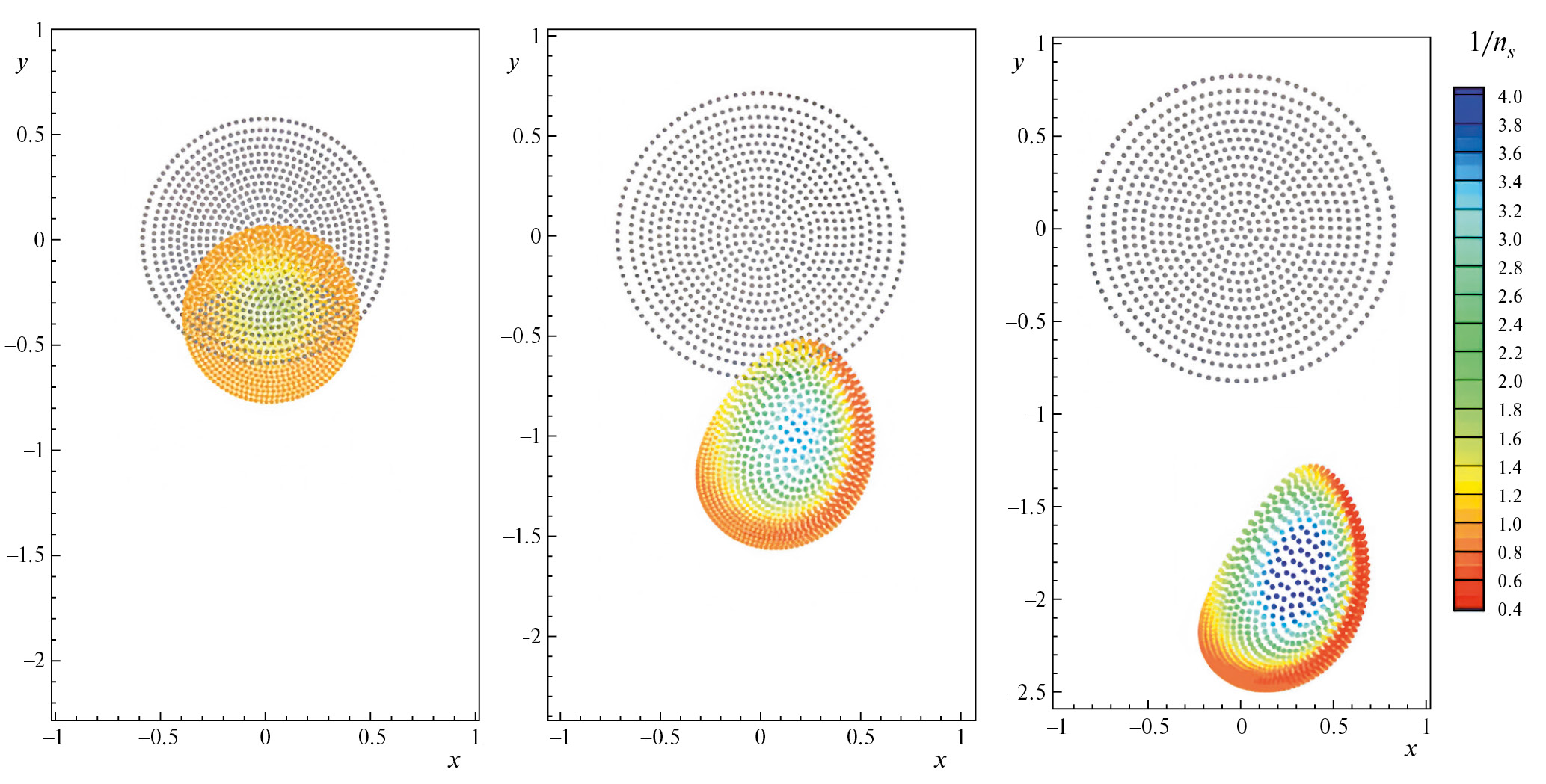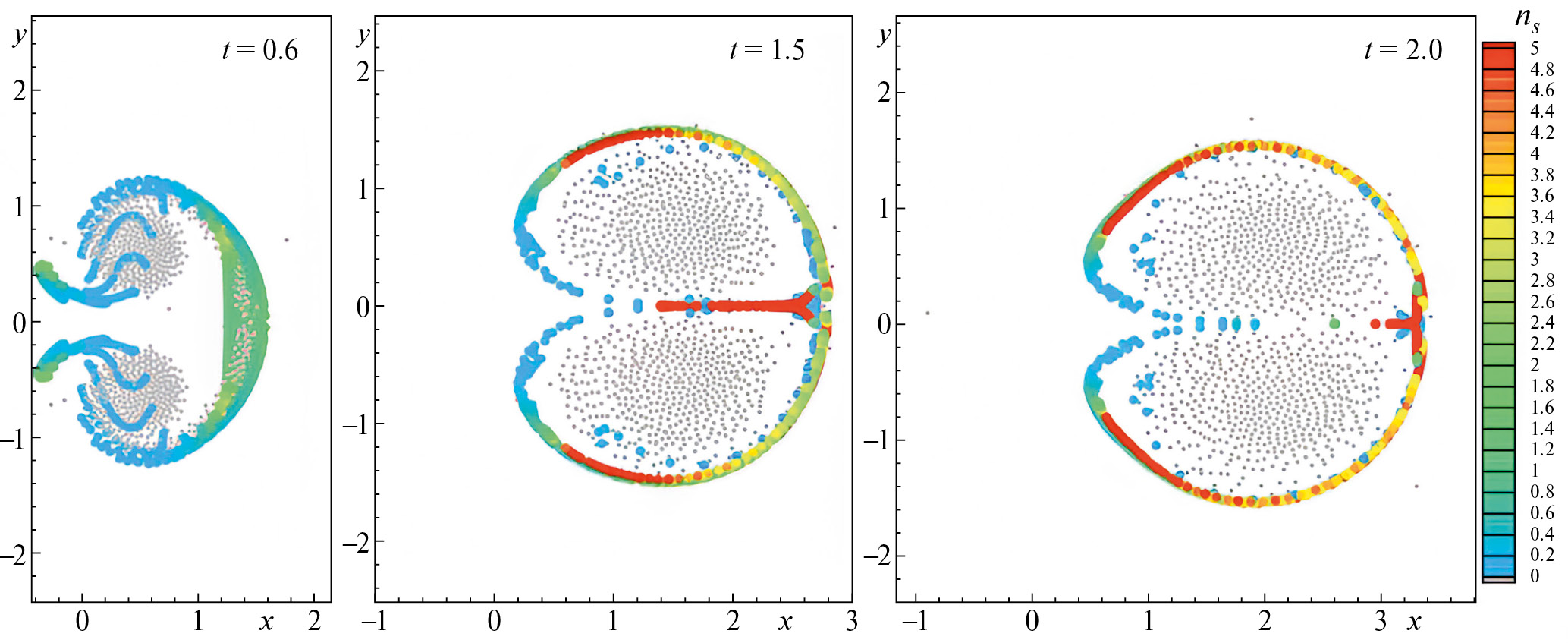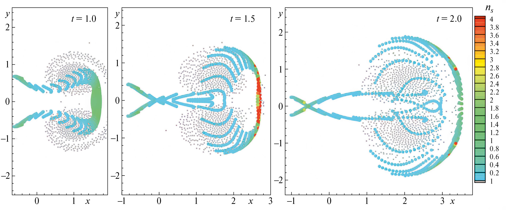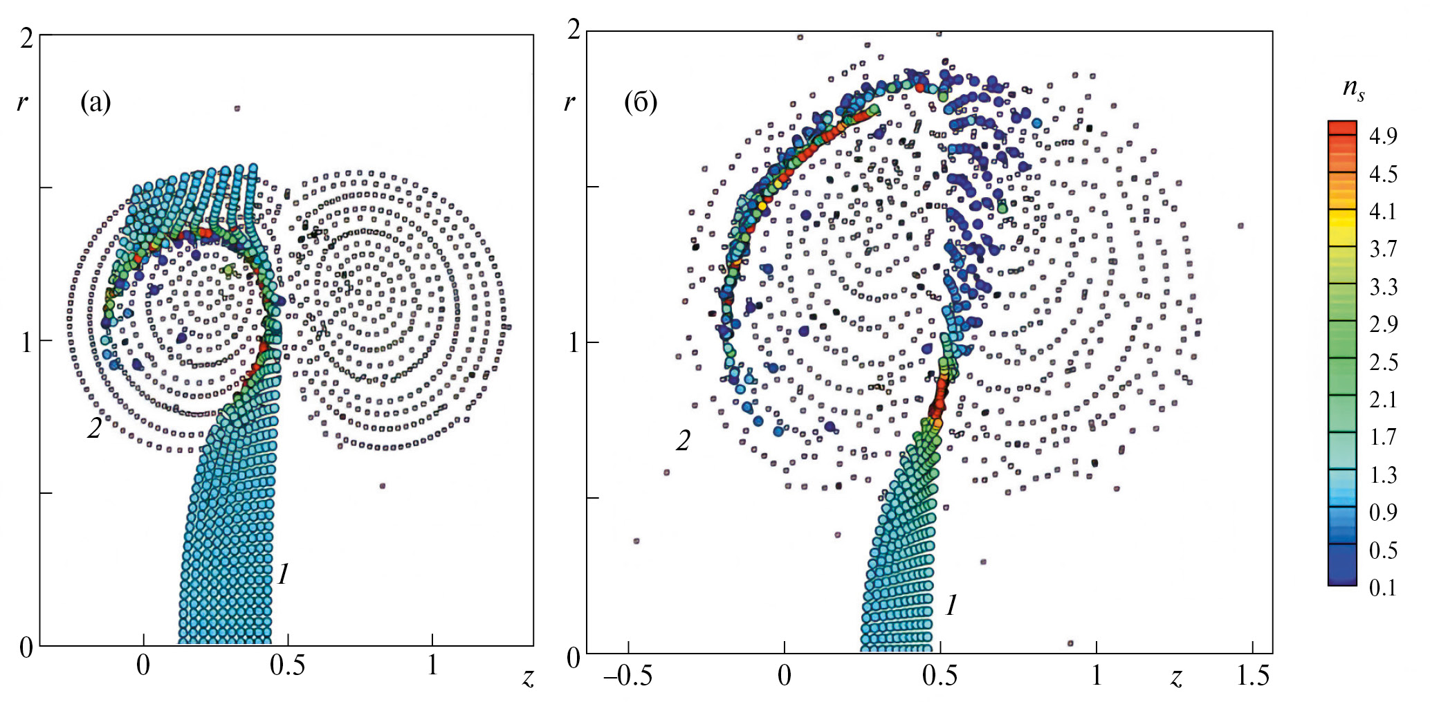 Расчет концентрации можно продолжить за точку пересечения траекторий частиц, при этом для автоматического учета возникновения “складки” определитель в уравнении неразрывности среды частиц, в общем случае, следует взять по модулю, как это сделано в выражении (2.1), поскольку за точкой пересечения траекторий меняется направление обхода лагранжева элемента. Если траектория частиц пересекает поверхность сильного разрыва параметров несущей фазы (например, ударную волну [41]), правые части ОДУ (2.1)–(2.2) и переменные Jij, Ωij, также претерпевают разрывы. При этом для продолжения расчетов параметров дисперсной фазы после разрыва на выбранной траектории следует учитывать непрерывность координат и скоростей среды частиц, а также их производных вдоль поверхности разрыва.