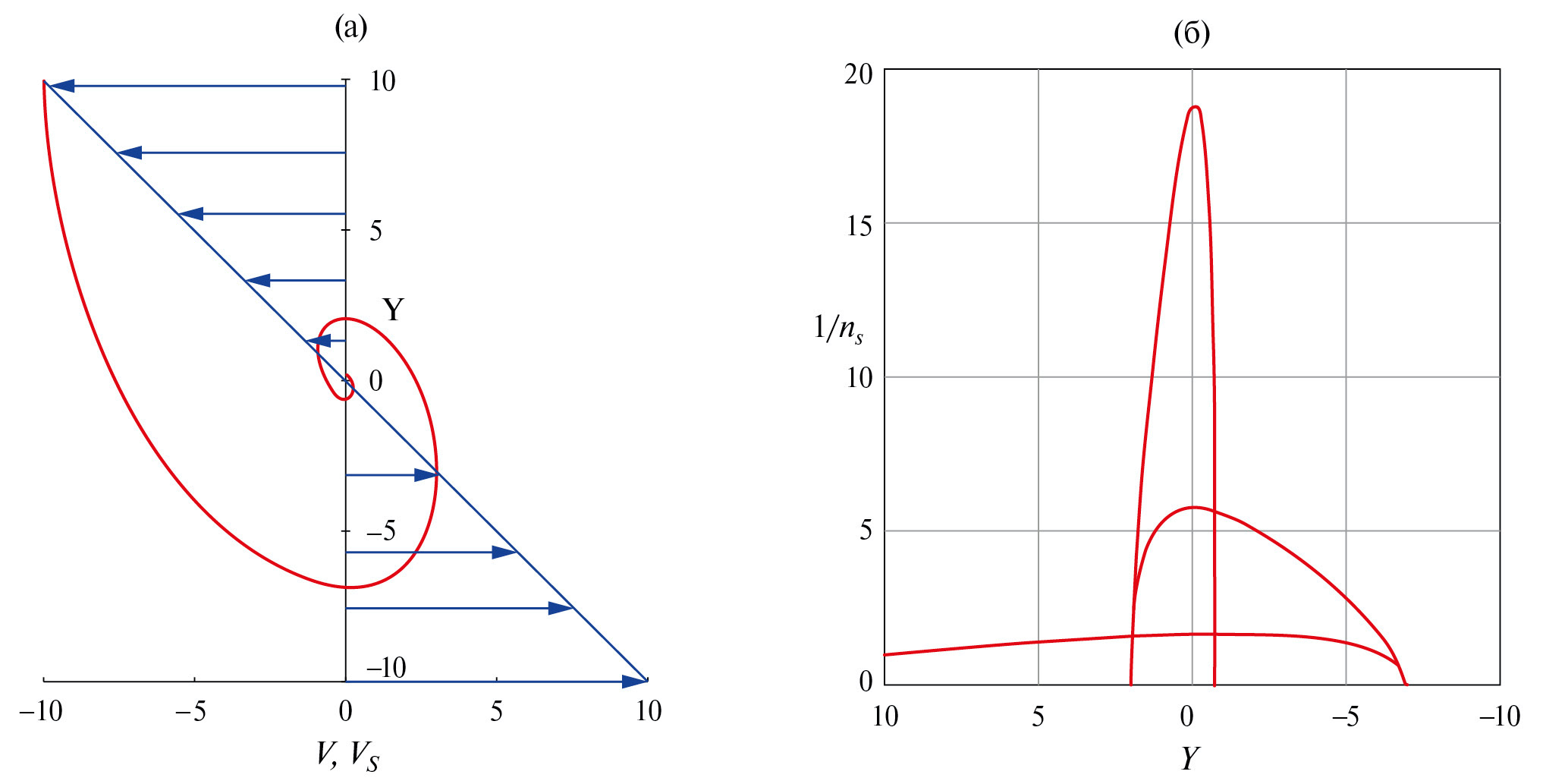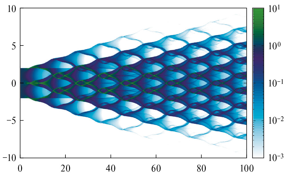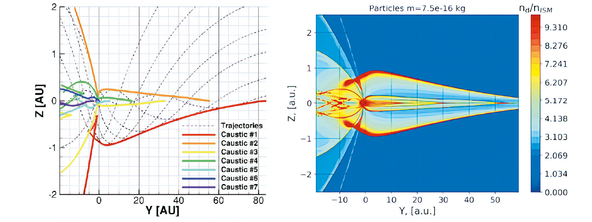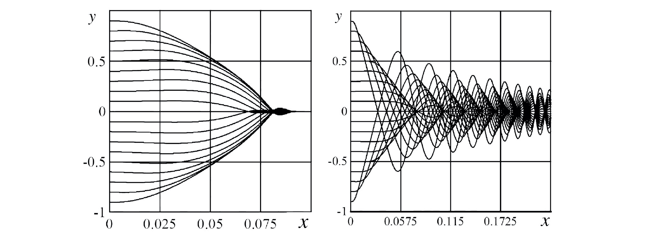 На каустиках, являющихся огибающими траекторий частиц в точках разворота траекторий и лежащих в области конечных значений скорости несущей фазы, числовая плотность частиц имеет интегрируемую сингулярность типа [30], где — расстояние до точки сингулярности x0. При учете небольшого распределения частиц по скоростям (малого отличия исходной функции распределения частиц по скоростям от дельта-функции) числовая плотность среды частиц вблизи каустики становится конечной, оставаясь достаточно большой [31].