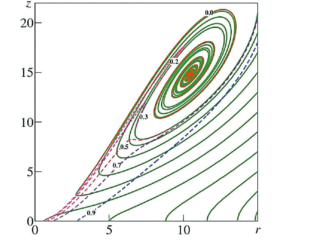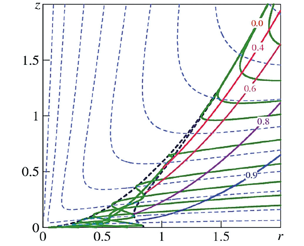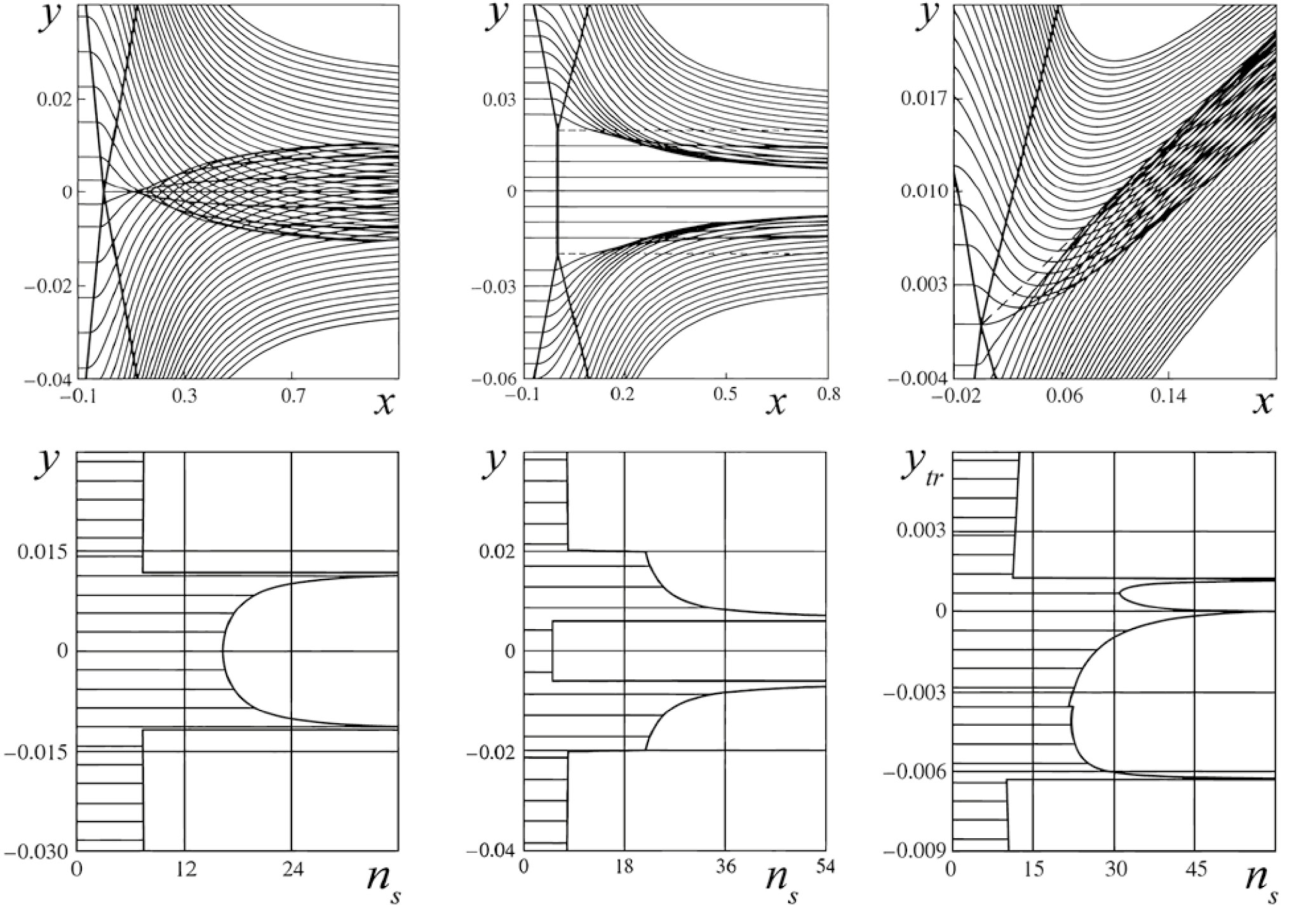 Предложенный метод расчета концентрации частиц устраняет проблему пересекающихся траекторий, так как различным траекториям, пересекающимся в одной и той же точке физического пространства, соответствуют различные значения лагранжевых координат r0 и t. Границы областей пересекающихся траекторий (каустики) легко определяются в процессе расчета, поскольку на них якобиан обращается в ноль.