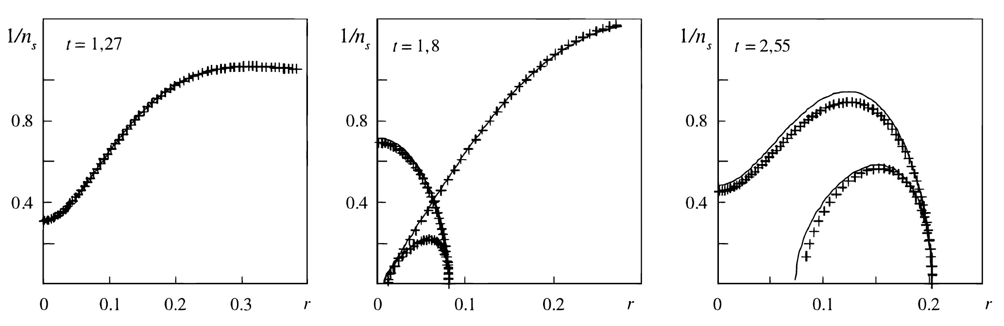 Из выражения (1.5) следует, что, несмотря на неограниченный рост числовой плотности на каустике, среднее расстояние между частицами остается конечным, поскольку конечный лагранжев объем среды частиц “схлопывается” не в точку, а в конечный элемент поверхности с конечной поверхностной плотностью среды частиц. Оценки показывают [17], что для большинства типичных сингулярностей плотности среды частиц, возникающих при моделировании течений газовзвесей в условиях, представляющих интерес для приложений, среднее расстояние между частицами в точках сингулярности числовой плотности остается много больше размера частиц, т. е. бесстолкновительная модель дисперсной фазы остается применимой.
