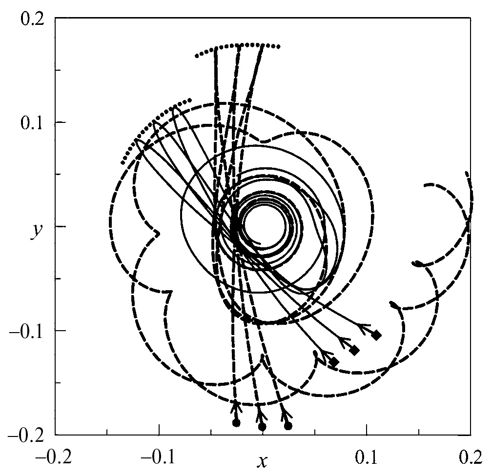 В условиях обтекания частицы в режиме сплошной среды при конечных Ms для Cd широко используются аппроксимационная формула из работы [26]. Выражение для Cd при свободномолекулярном режиме обтекания частиц можно найти, например, в работе [27]. При учете вращения частиц и движении частиц в узких областях с большими градиентами продольной скорости (пограничных слоях, слоях смешения, узких каналах) важную роль играют подъемные силы, действующие на частицы (см. примеры в разд. 8). Среди сил негидродродинамической природы, влияющих на динамику частиц, часто учитываются сила тяжести mg (здесь g — в общем случае, градиент гравитационного потенциала) и сила Лоренца (в системе СИ), действующая на заряженную частицу с зарядом e во внешнем электромагнитном поле с напряженностями E и B [23, 28]