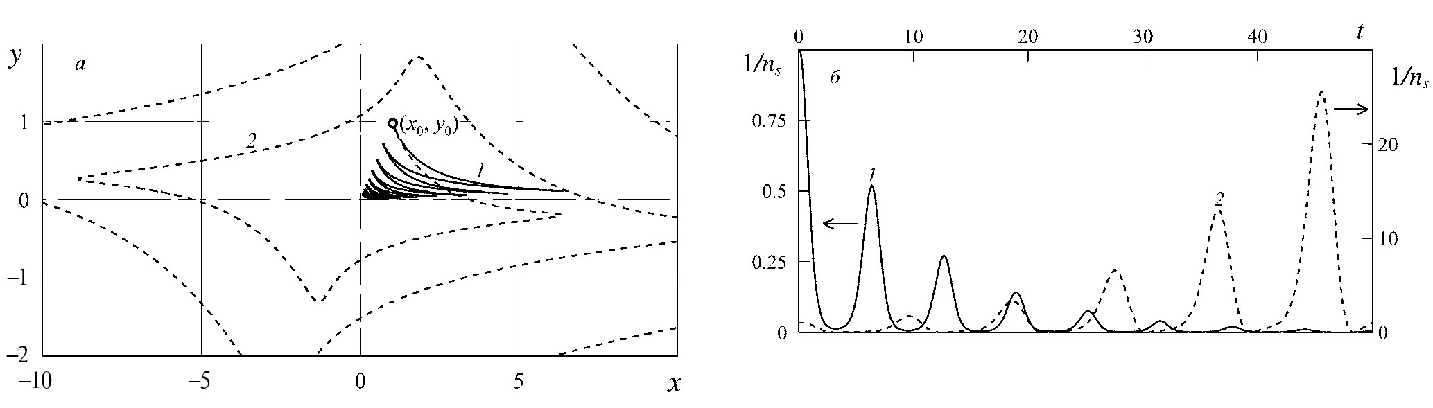 Стационарность траекторий частиц позволяет также значительно упростить процедуру нахождения нестационарного поля концентрации в случае, когда граничные условия для концентрации известным образом зависят от времени (ns0(r0, tg) = G(tg), tg — “глобальное” время) (например, при исследовании эволюции неоднородностей концентрации в стационарном поле скоростей несущей фазы [43]). В этом случае, как следует из выражения (4.3), мгновенное значение концентрации на выбранной траектории в момент t (здесь t — время движения частицы по траектории от точки r0) выражается через функцию G и значение концентрации nst(r0,t), найденное для стационарного граничного условия ns0 = 1: