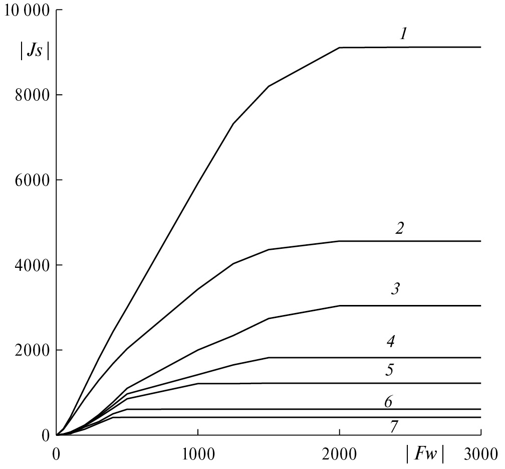 Рис. 1. Вольтамперные характеристики для трех различных конфигураций факела по ширине и интенсивности (высоты ступеньки) источника ионизации W. Линии: 1 — W = 10, 0.2 < x < 0.8; 2 — W = 5, 0.2 < x < 0.8; 3 — W = 10, 0.4 < x < 0.6; 4 — W = 6, 0.4 < x < 0.6; 5 — W = 4, 0.4 < x < 0.6; 6 – W = 10, 0.47 < x < 0.53; 7 – W = 4, 0.47 < x < 0.53.