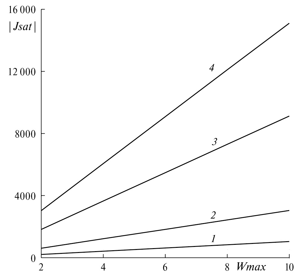 Рис. 2. Зависимость тока насыщения от интенсивности источника заряженных частиц W для разной ширины горящей области L. Линии: 1 — L = 0.06, 2 — L = 0.2, 3 — L = 0.6, 4 — L = 1.