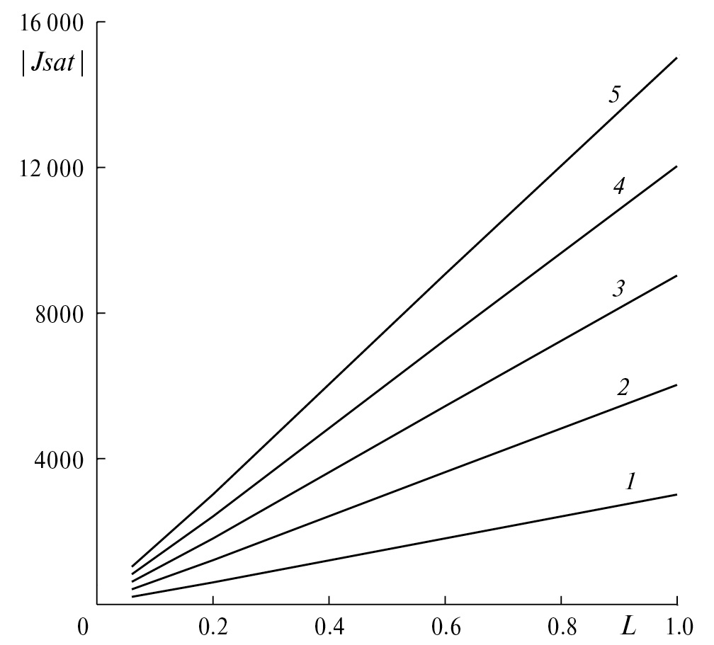 Рис. 3. Зависимость тока насыщения Jsat от характерного размера источника заряженных частиц L для разных W. Линии: 1 – W = 2, 2 – W = 4, 3 – W = 6, 4 – W = 8, 5 – W = 10.