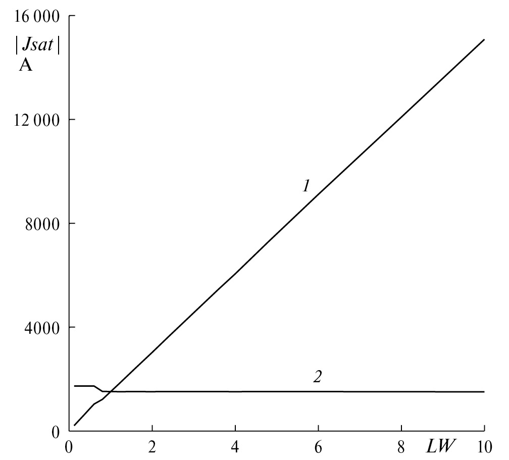 Рис. 4. Зависимость тока насыщения Jsat от произведения LW (линия 1); линия 2 – величина А в соотношении (2.1) для разных значений LW.