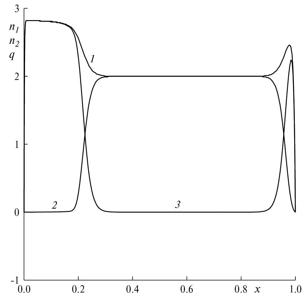 Рис. 5. Электроды полностью погружены в область горения. Распределения концентраций заряженных частиц и объемного заряда q в слабом приложенном поле (W = 4, L = 1, Fw = –100). Линии: 1 — n1, 2 — n2, 3 — q.