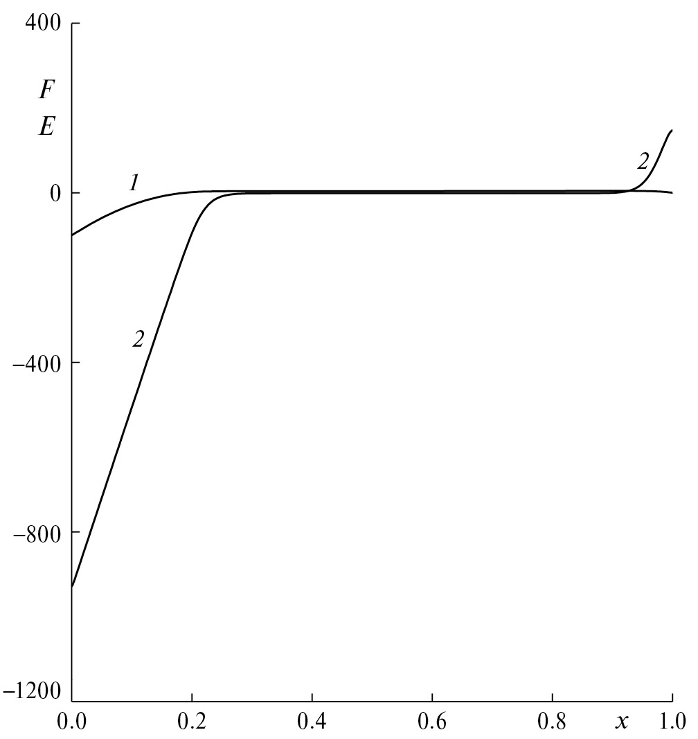 Рис. 6. Электроды полностью погружены в область горения. Распределения электрического потенциала F (линия 1) и напряженности поля E (линия 2) в слабом приложенном поле (W = 4, L = 1, Fw = –100).