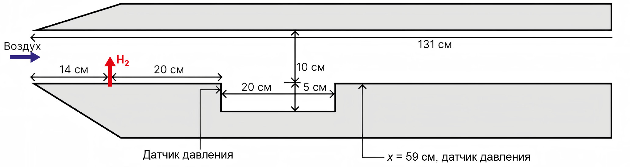 Каверна длиной 20 см и глубиной 5 см (L/D = 4) располагалась на расстоянии 20 см ниже по потоку от инжектора. Подача водорода осуществлялась со звуковой скоростью перпендикулярно потоку через миллиметровую щель. Набегающий поток газа поступал в камеру со скоростью 3 Маха, температурой 600 К и давлением 0.1 МПа. Давление подаваемого топлива Pinj было 0.5, 1, и 1.5 МПа, а коэффициент избытка топлива равнялся 0.167, 0.33 и 0.5, соответственно. В отличие от работ Чоя [14–16], в которой осуществлялась подача холодного (151 К) водорода, в данной работе температура подаваемого топлива задавалась 800 К. Измерения давления производились после каверны на нижней стенке при x = 59 см, а также возле всех углов каверны.