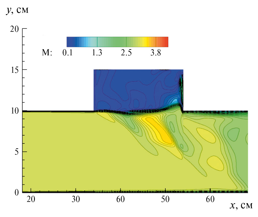 Рис. 2. Распределение числа Маха в расчетной области в момент затекания внешнего сверхзвукового течения в область каверны. Анимационный файл поля числа Маха в последовательные моменты времени представлен в приложении Fig_02_Mach_no_H2.avi.