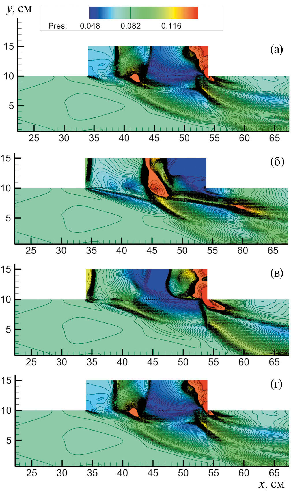 Рис. 3. Распределение давления в расчетной области в последовательные моменты. Анимационный файл поля давления в последовательные моменты представлен в приложении Fig_03_Pres_no_H2.avi.