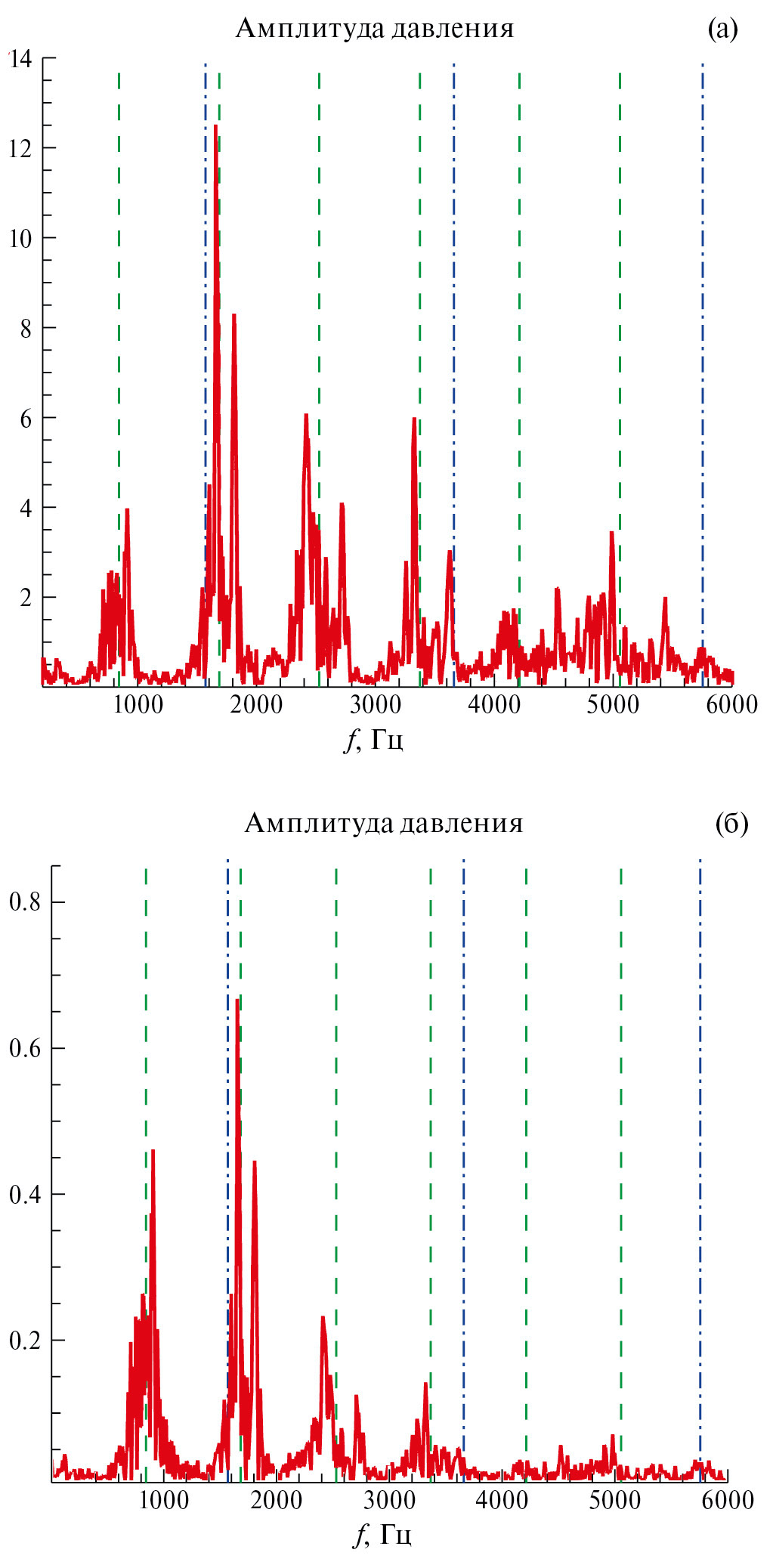 Рис. 4. Спектр колебаний давления (а) внутри каверны (б) на стеке камеры на расстоянии 59 см от начала камеры. Зелеными пунктирными линиями обозначены частоты расходных колебаний (842, 1685, 2527, 3370, 4212, 5055 Гц). Синей пунктирной линией с точкой обозначены частоты акустических колебаний Росситера (1569, 3661, 5754 Гц).