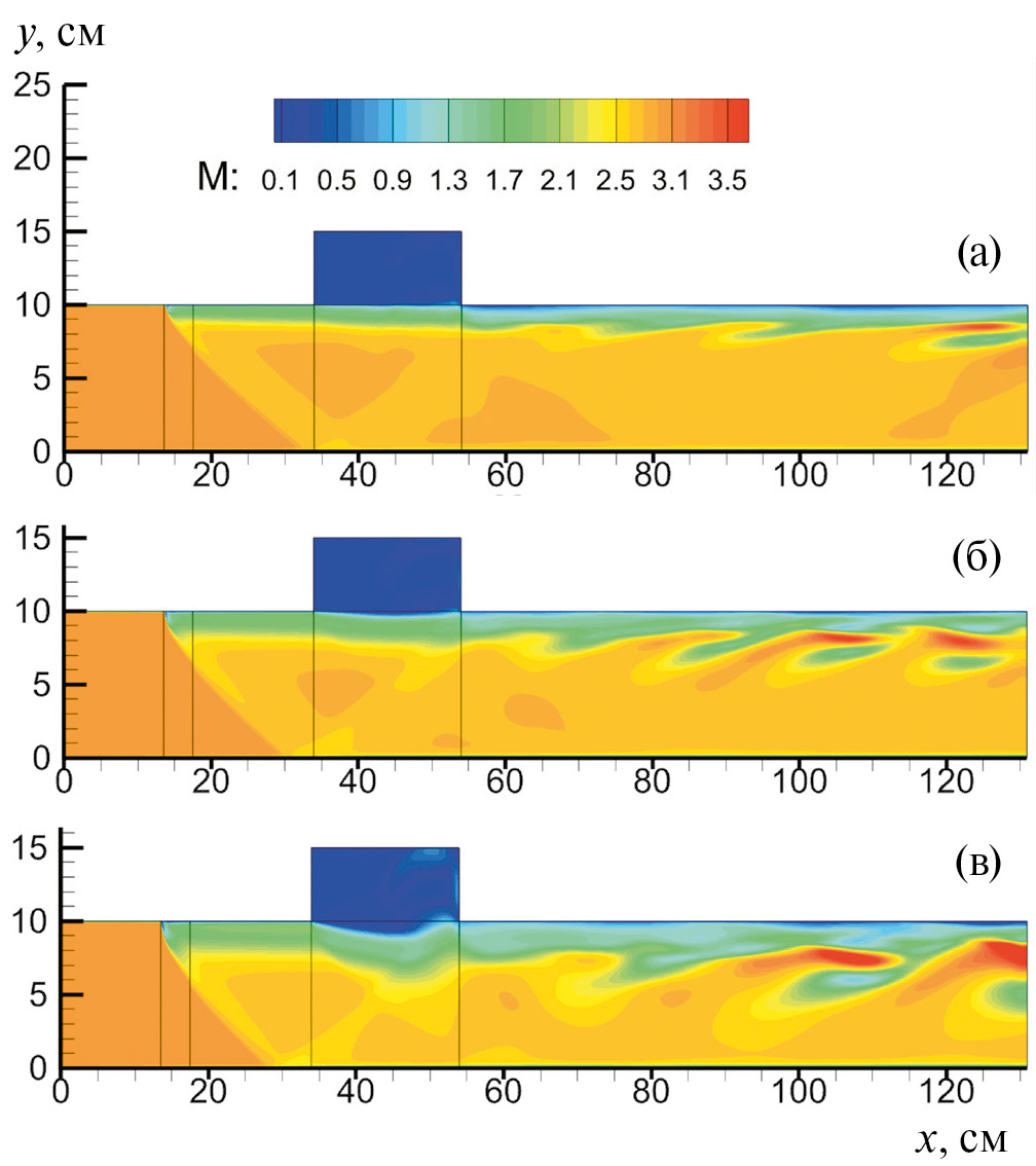 Рис. 6. Распределение числа Маха в расчетной области для различных давлений подачи топлива: (а) Pinj = 0.5 МПа, (б) Pinj = 1 МПа, (в) Pinj = 1.5 МПа. Анимационный файл рассчитанного числа Маха для давления подачи топлива Pinj = 1 МПа представлен в приложении Fig_05_Mach _H2.avi.
