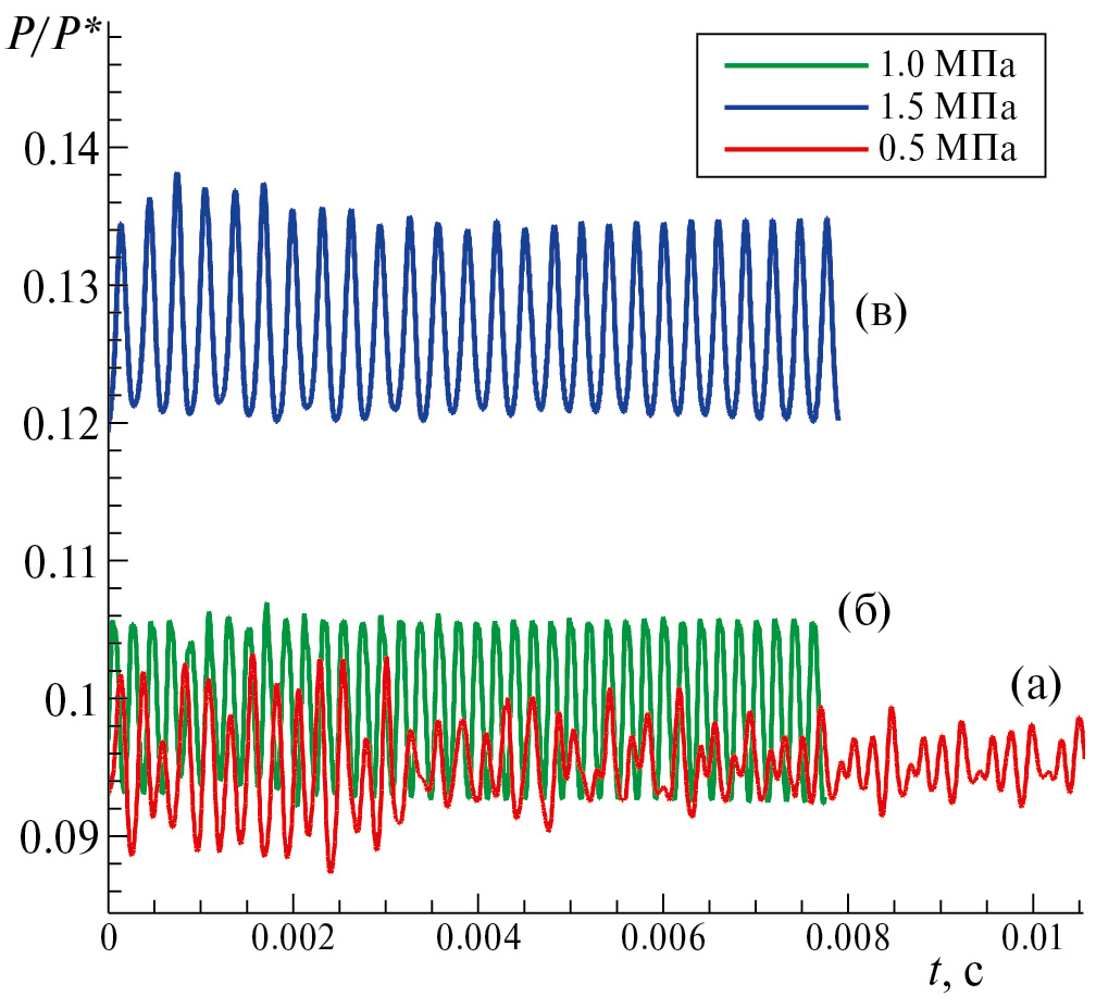 Рис. 7. Временная зависимость безразмерных показаний датчика давления (x = 59 см) для различных давлений подачи топлива: (а) Pinj = 0.5 МПа, (б) Pinj = 1 МПа, (в) Pinj = 1.5 МПа.