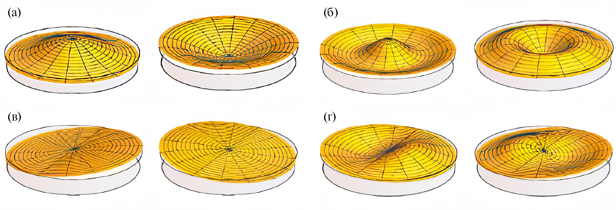 Рис. 1. Профили волн максимального развития для осесимметричных и асимметричных мод при t = 0, p/w (Anm = 3 см, Bnm = 0; R0 = 9.8 см; h = 4 см): (а–г) — (0, 1), (0, 2), (1, 1) и (1, 2).