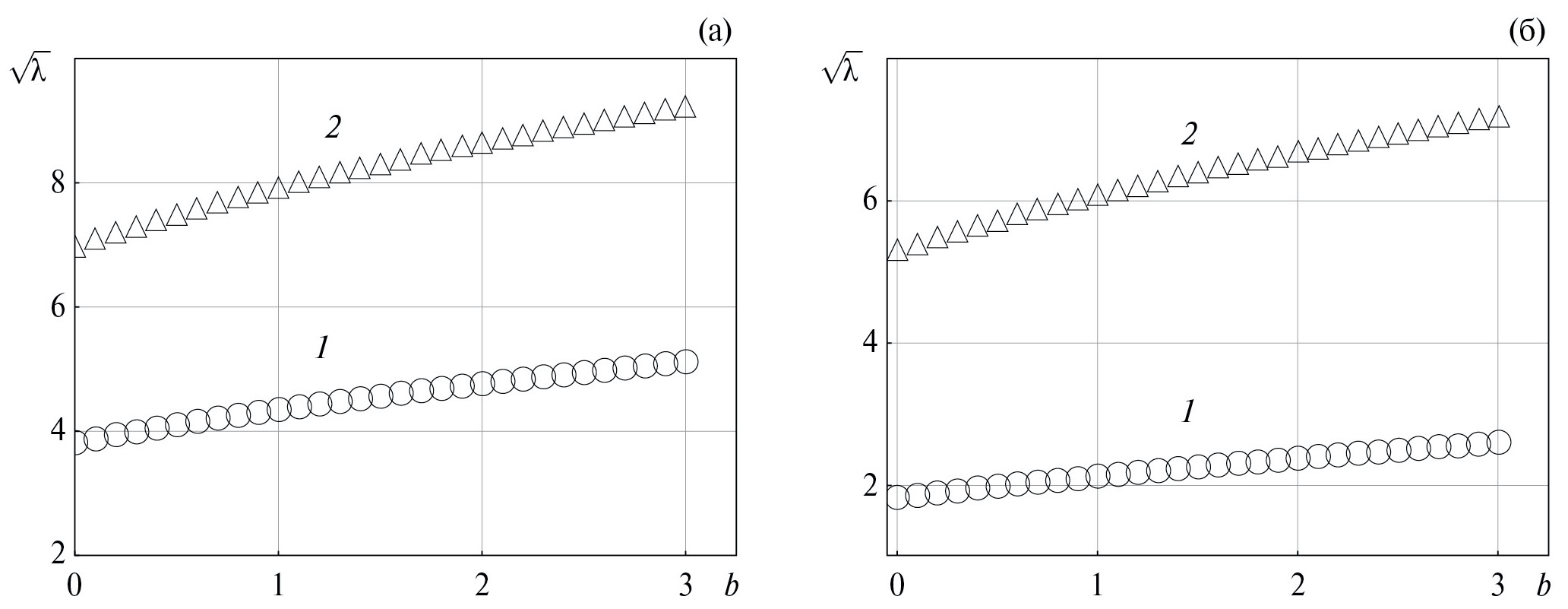 Рис. 2. Зависимости безразмерных собственных частот от параметра b: (а) — осесимметричные волновые моды (1) и (2); (б) — асимметричные волновые моды (1) и (2).