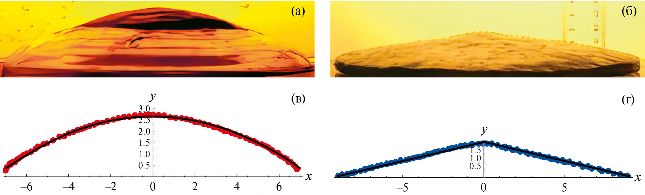 Рис. 3. Форма возвышения на дне сосуда (а, б) и графики аппроксимирующих профиль дна функций (в, г): (а, в), (б, г) — R0 = 7 и 9.8 см; точки — данные оцифровки фотографий (а, б).