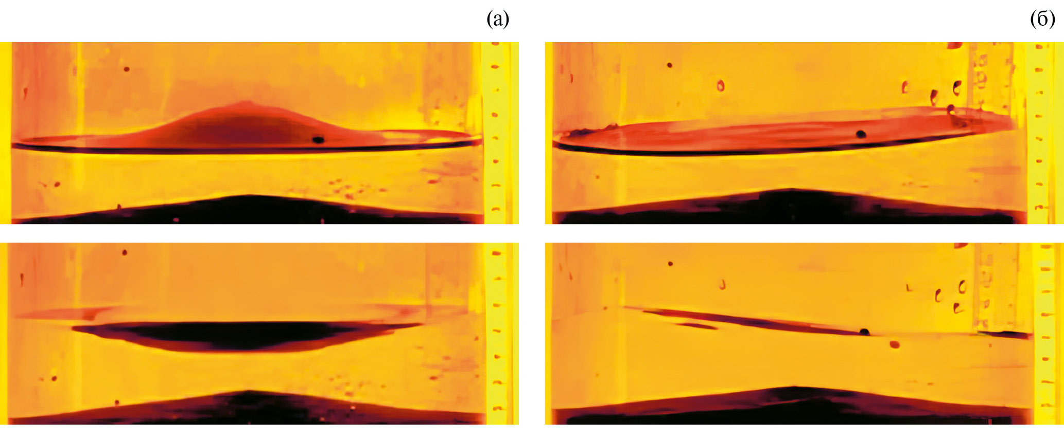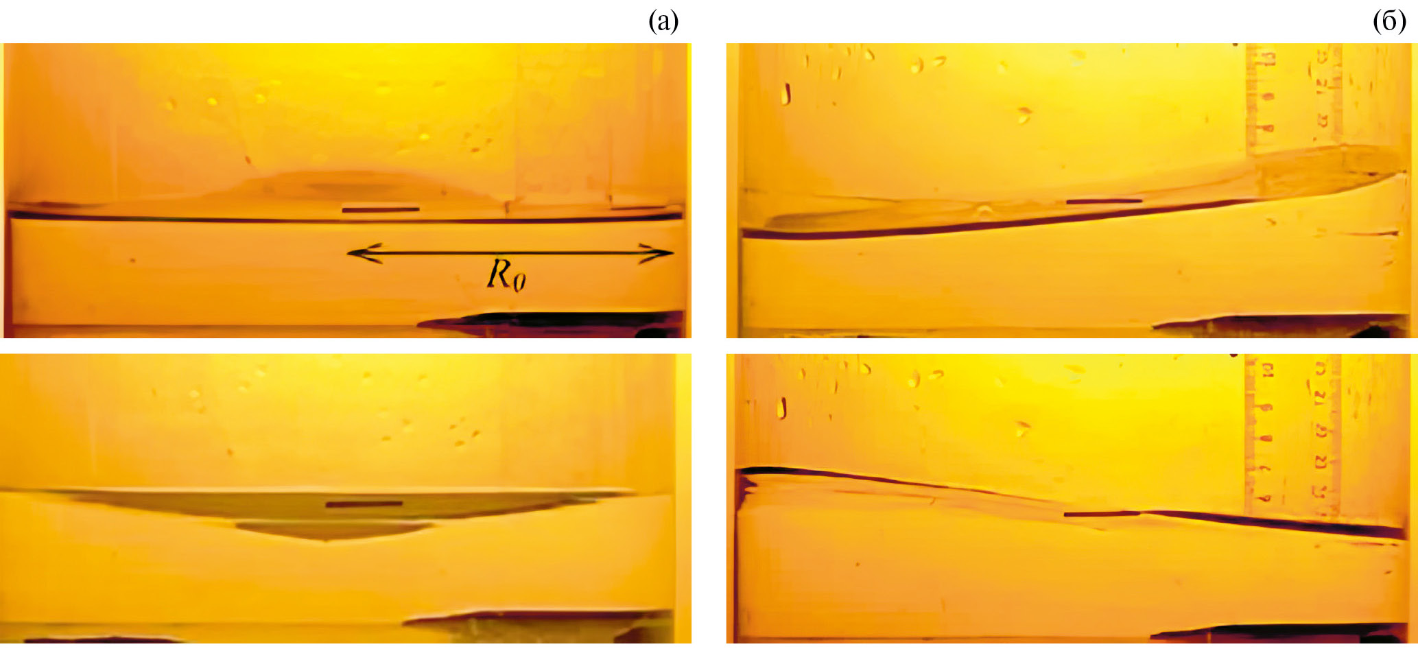 Профилированное дно представляло собой симметричное относительно оси сосуда возвышение, изготовленное из технического пластилина. На рис. 3а и 3б приведены фотографии дна сосудов с R0 = 7 и 9.8 см соответственно.