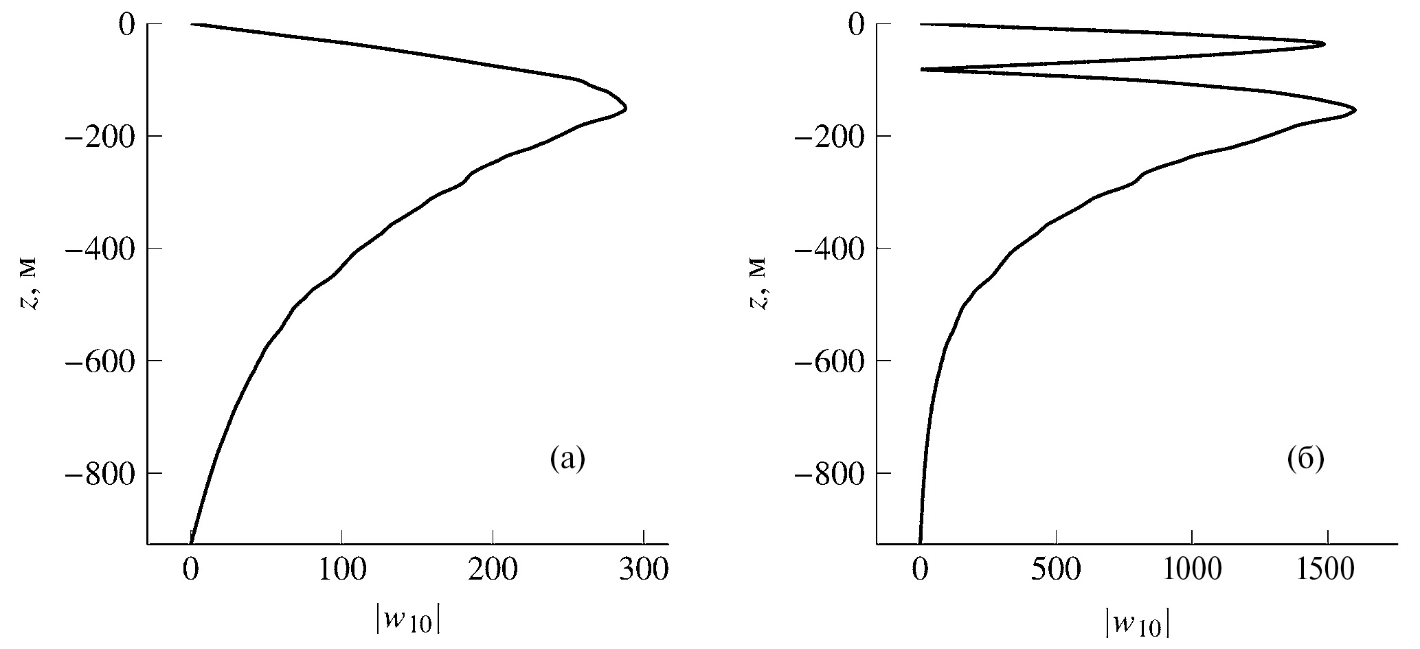 Поиск оптимального значения k основан на методе дихотомии [13]. Собственная функция – решение краевой задачи (2.5)–(2.7) — комплексная, поэтому вертикальный волновой поток импульса uw (3.1) отличен от нуля. Вертикальные профили модуля собственных функций первой и второй моды 15-минутных внутренних волн показаны на рис. 2.