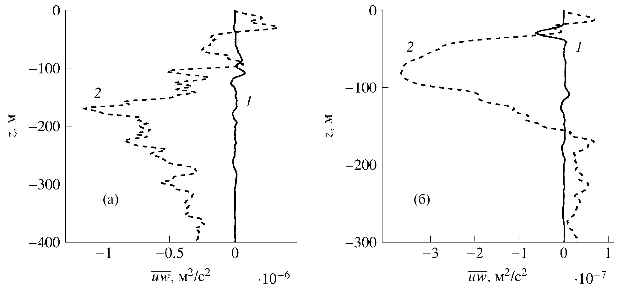 В более глубинных стратифицированных слоях коэффициент турбулентного обмена пропорционален Nc [19]. На рис. 7 представлены профили волнового uw (сплошная линия) и турбулентного (пунктирная линия) потоков импульса для первых двух мод при прямом численном решении краевой задачи (0.13)–(0.15). Турбулентный поток доминирует, особенно над потоком второй модой. Только в пикноклине у первой моды волновой поток сопоставим с турбулентным в интервале глубин 80–120 м.