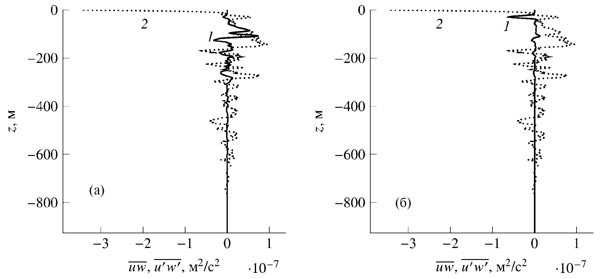 Рис. 7. Вертикальные профили волнового uw и турбулентного потоков импульса для первой (а) и второй (б) мод: 1 — волновой поток импульса; 2 — турбулентный поток.