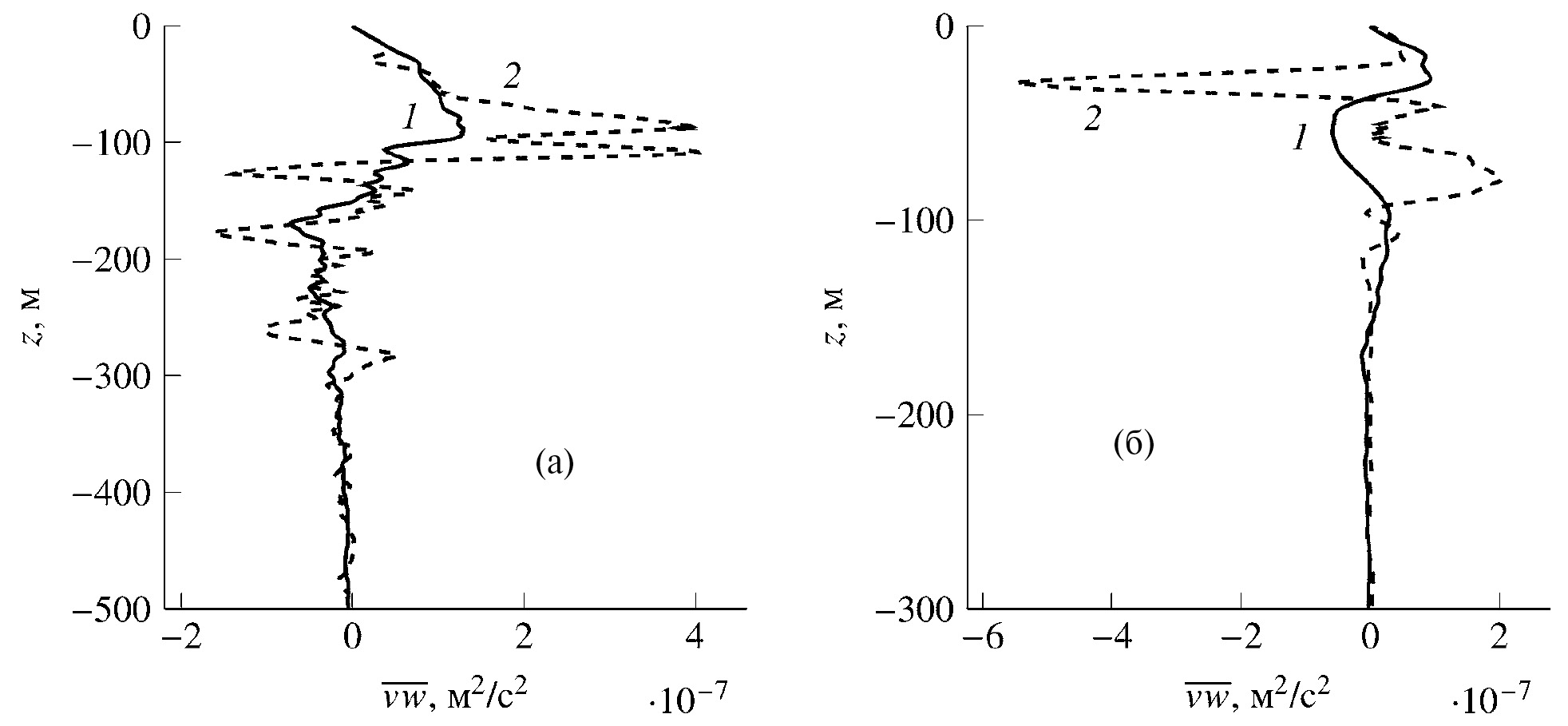 Рис. 9. Вертикальные профили волнового vw и турбулентного потоков импульса для первой (а) и второй (б) мод: 1 — волновой поток импульса; 2 — турбулентный поток.