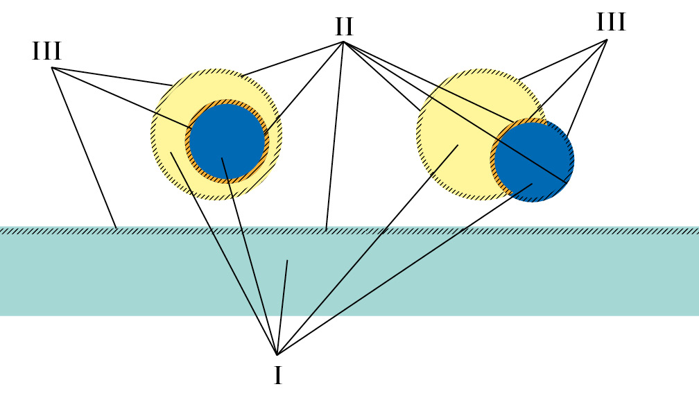 Рис. 1. Структура капельной жидкости (слева – оболочечная, справа – дуальная капля): I – III – толща, приповерхностный и поверхностный слои.