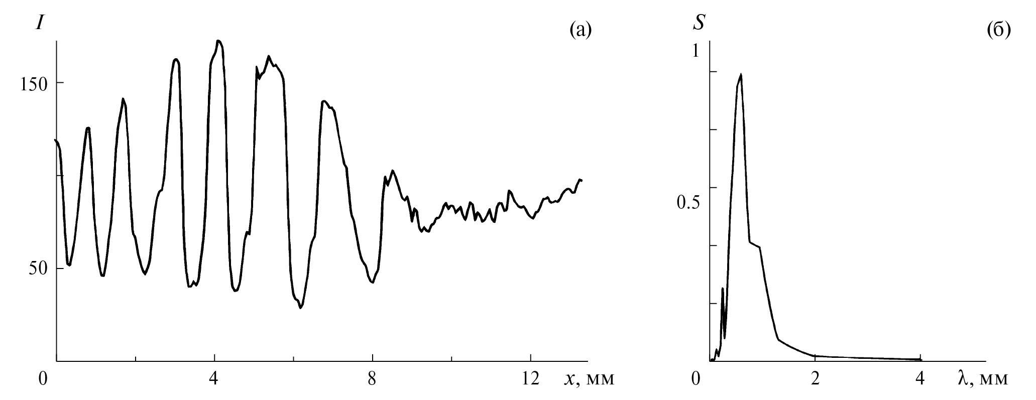 Рис 10. Структура полосчатого течения по данным рис. 9е: фигуры a, б – распределение относительной освещенности I, нормированной на максимальной значение, вдоль центральной нормали к полосам в правом нижнем квадранте и его пространственный спектр S.