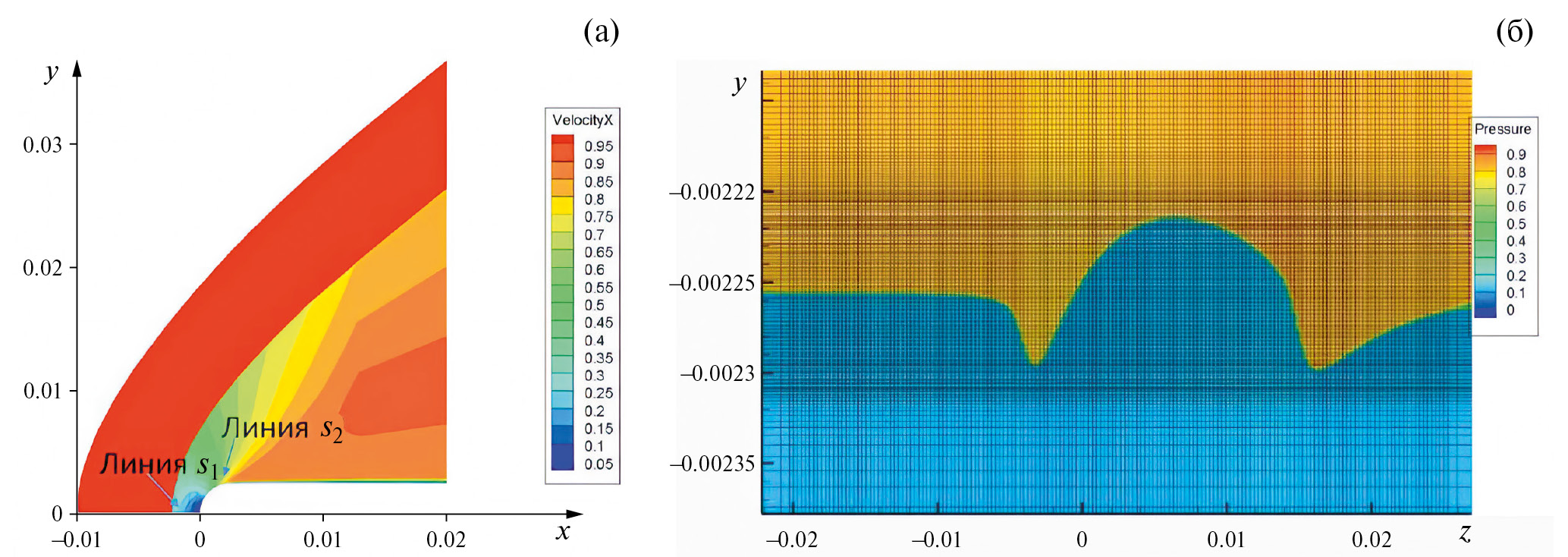 Боковые границы подобласти 1 не визуализированы на рис. 3; на ближней к читателю границе накладывается условие первого рода, соответствующее набегающему вдоль оси x газовому потоку. На другой границе накладывается мягкое граничное условие в виде экстраполяции всех зависимых газодинамических переменных задачи изнутри расчетной области вдоль сеточных линий. На верхней и нижней границах по оси y накладываются условия симметрии.