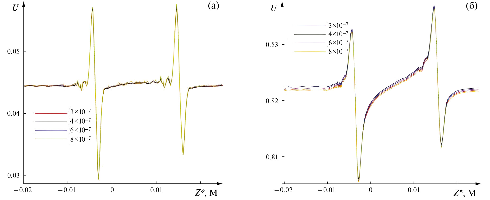 Рис. 13. Возмущение продольной компоненты скорости в сечении y* = 0.0033 м: острая (а) и затупленная (б) пластина.