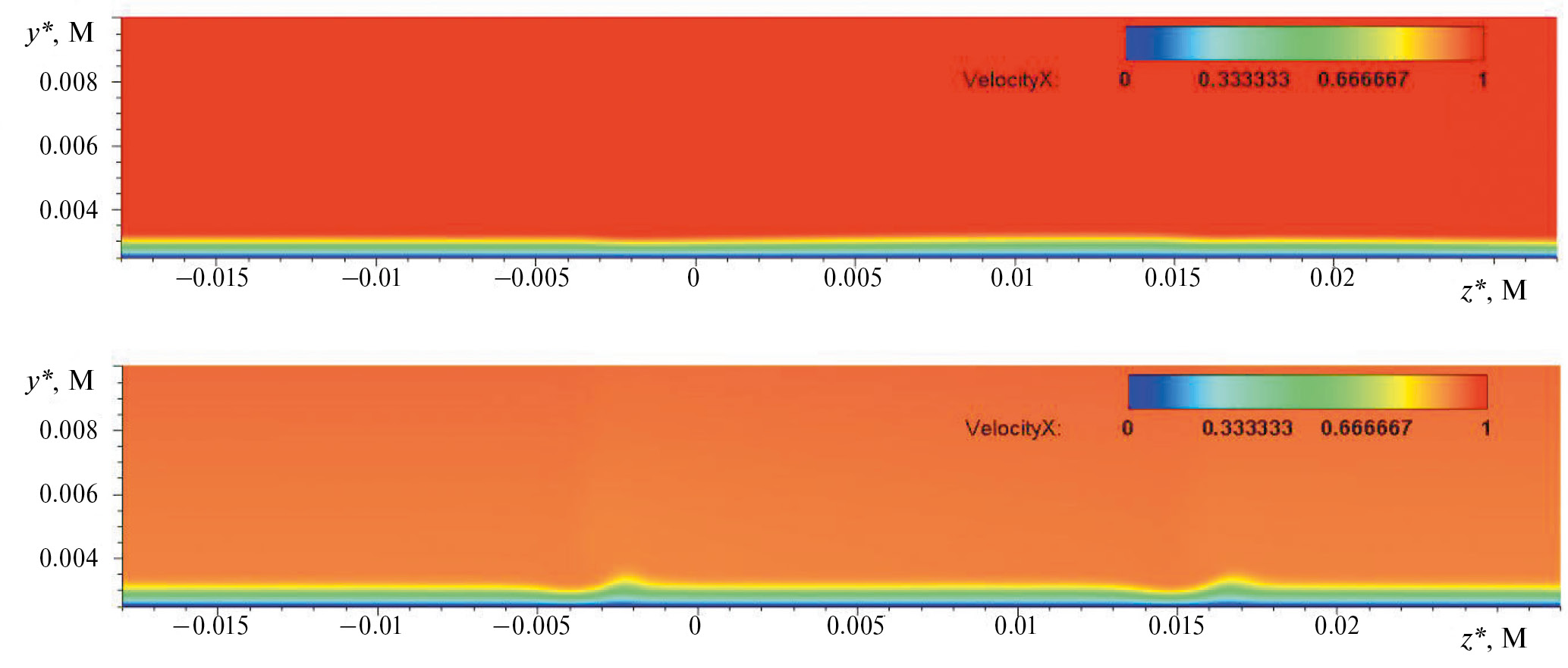 На рис. 3 также построены сечения с полями продольной компоненты вектора скорости и одна из сеточных плоскостей. Левые границы рис. 3а и 3б соответствуют стенке АДТ; на них накладывается условие прилипания потока и теплоизолированной поверхности, а также условие возбуждения N-волны, описанное выше. N-волна распространяется вниз по потоку. Из приведенных данных можно заключить, что максимальное относительное возмущение продольной компоненты вектора скорости, вызванное неровностью, составляет около 1.4%.