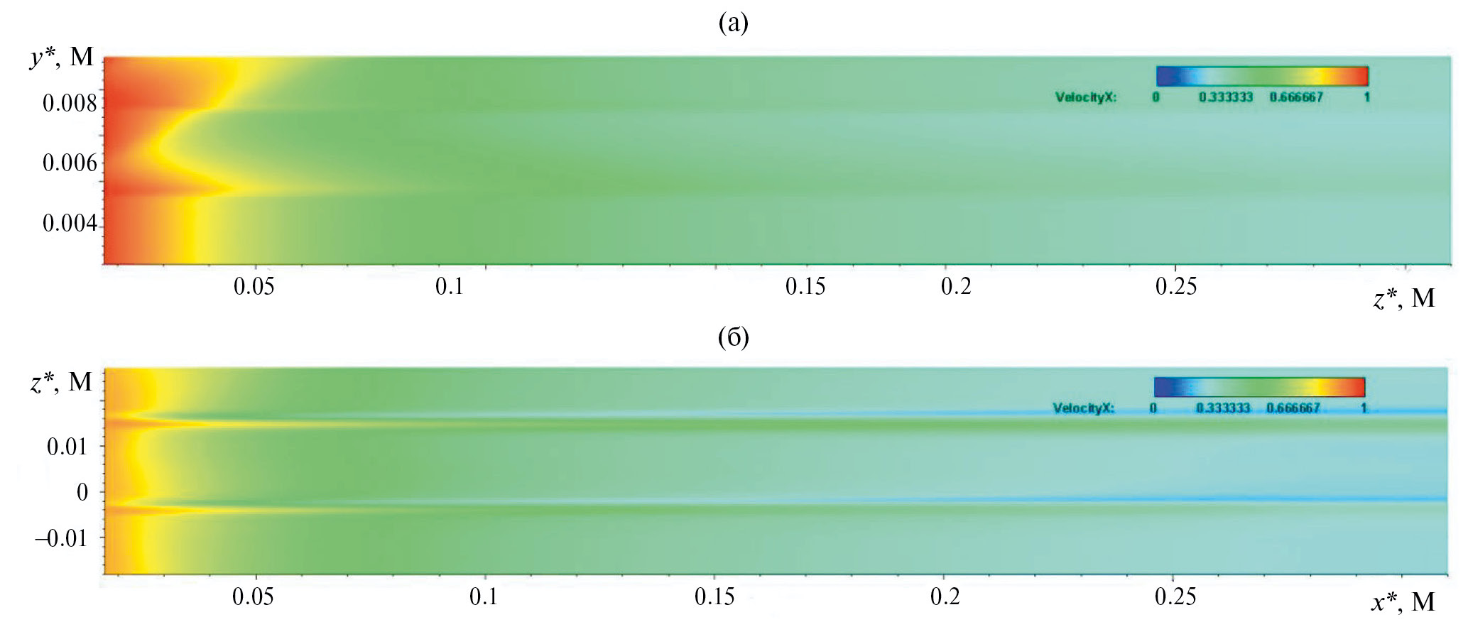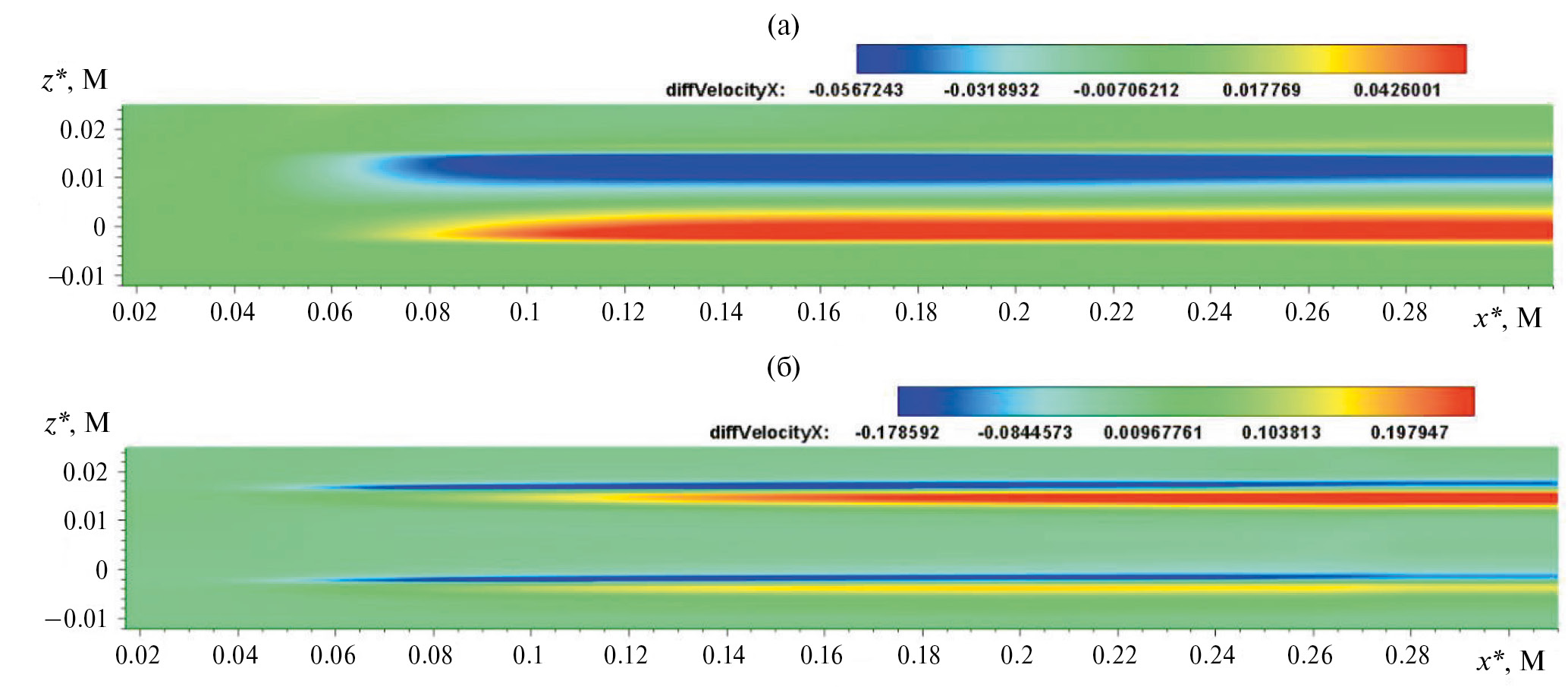 Рис. 12. Поле продольной компоненты скорости в сечении y* = 0.0029 м: острая (а) и затупленная (б) пластина.