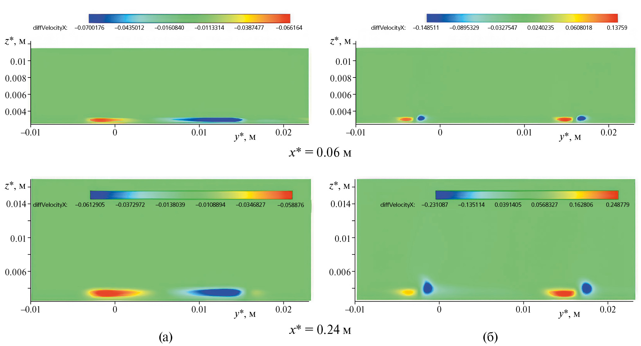 На рис. 12 показаны соответствующие поля продольной компоненты скорости показаны на виде сверху в сечении y * = 0.0029 м. За острой кромкой образуется широкий след из пары вихрей (в соответствии с исходной терминологией [6–10]), а за затупленной кромкой образуются два изолированные друг от друга следа меньшего поперечного размера.