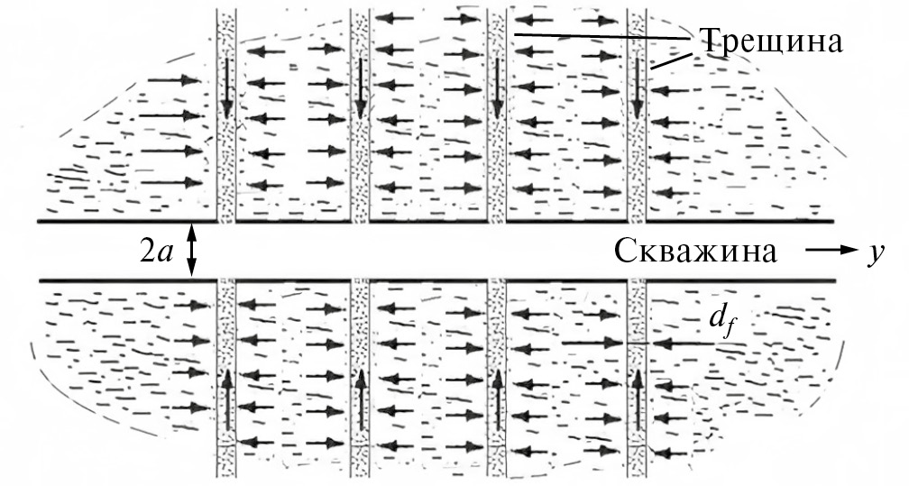 Трещины гидроразрыва могут обладать весьма необычными очертаниями, которые зависят от структуры пласта. Конфигурация трещин ГРП на вертикальных скважинах достаточно подробно изучена. Имеется большое число работ, в которых дается описание фильтрации флюида в призабойной зоне таких скважин [2–4].