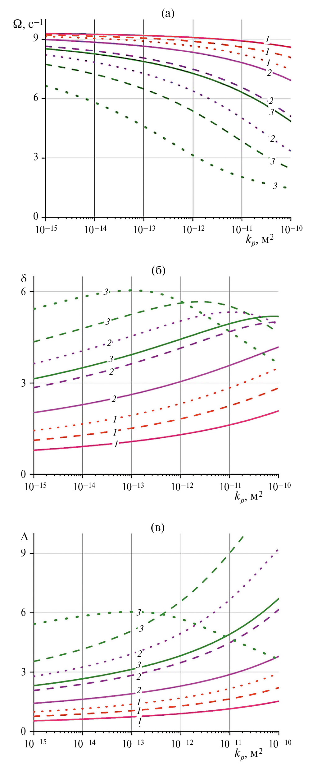 Рис. 3. Зависимости собственной частоты (а), коэффициента затухания (б) и декремента затухания (в) от проницаемости пласта kp при значениях ширины трещины: 1–3 – df = 1, 3, 5 мм и числе трещин: N = 7, 10, 13 – соответственно сплошная, штриховая, точечная линии.