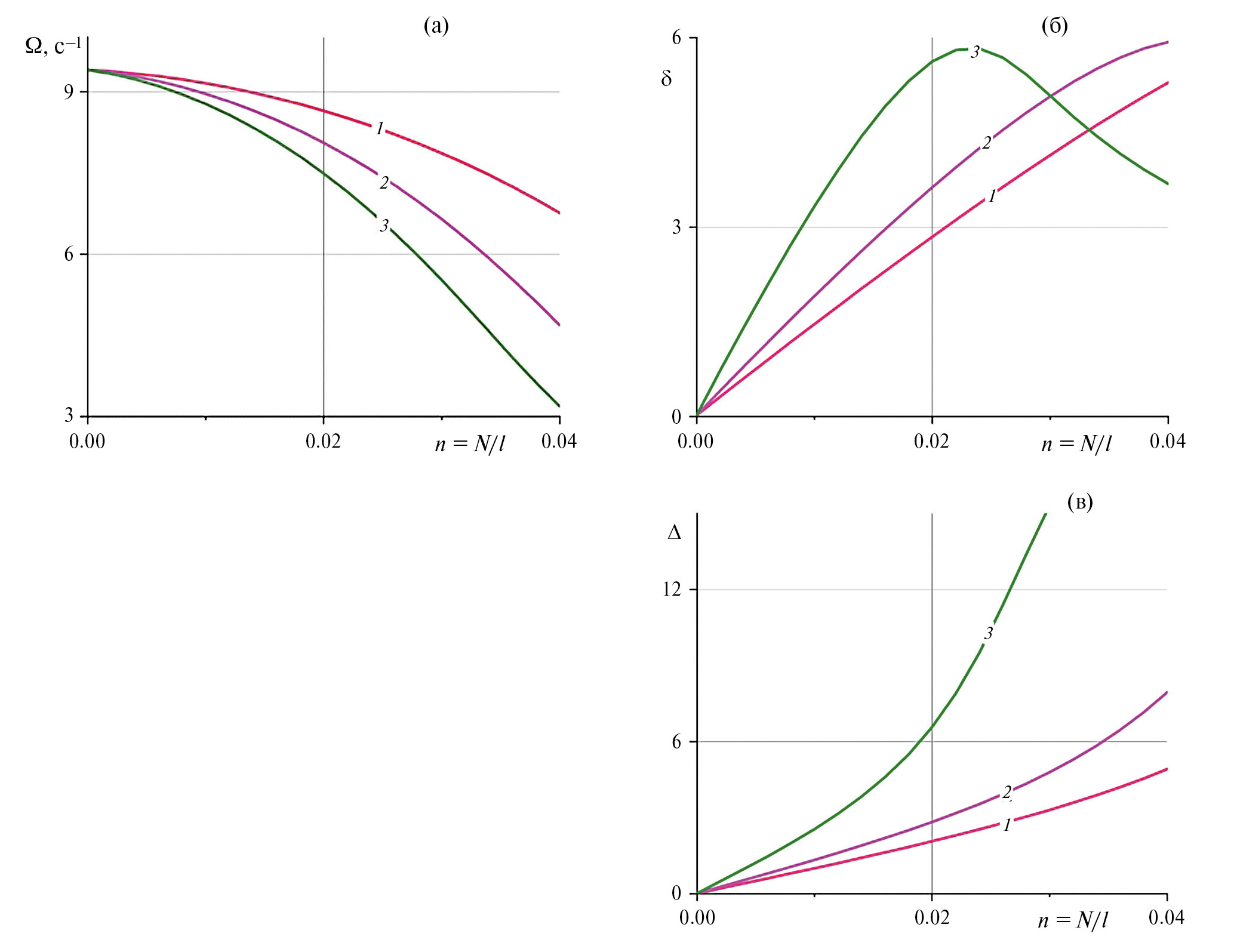 Рис. 4. Зависимости собственной частоты (а), коэффициента затухания (б) и декремента затухания (в) от количества трещин на единицу длины скважины n = N/l при ширине трещины df = 3 мм: 1–3 – kp = 10–15, 10–13, 10–12.