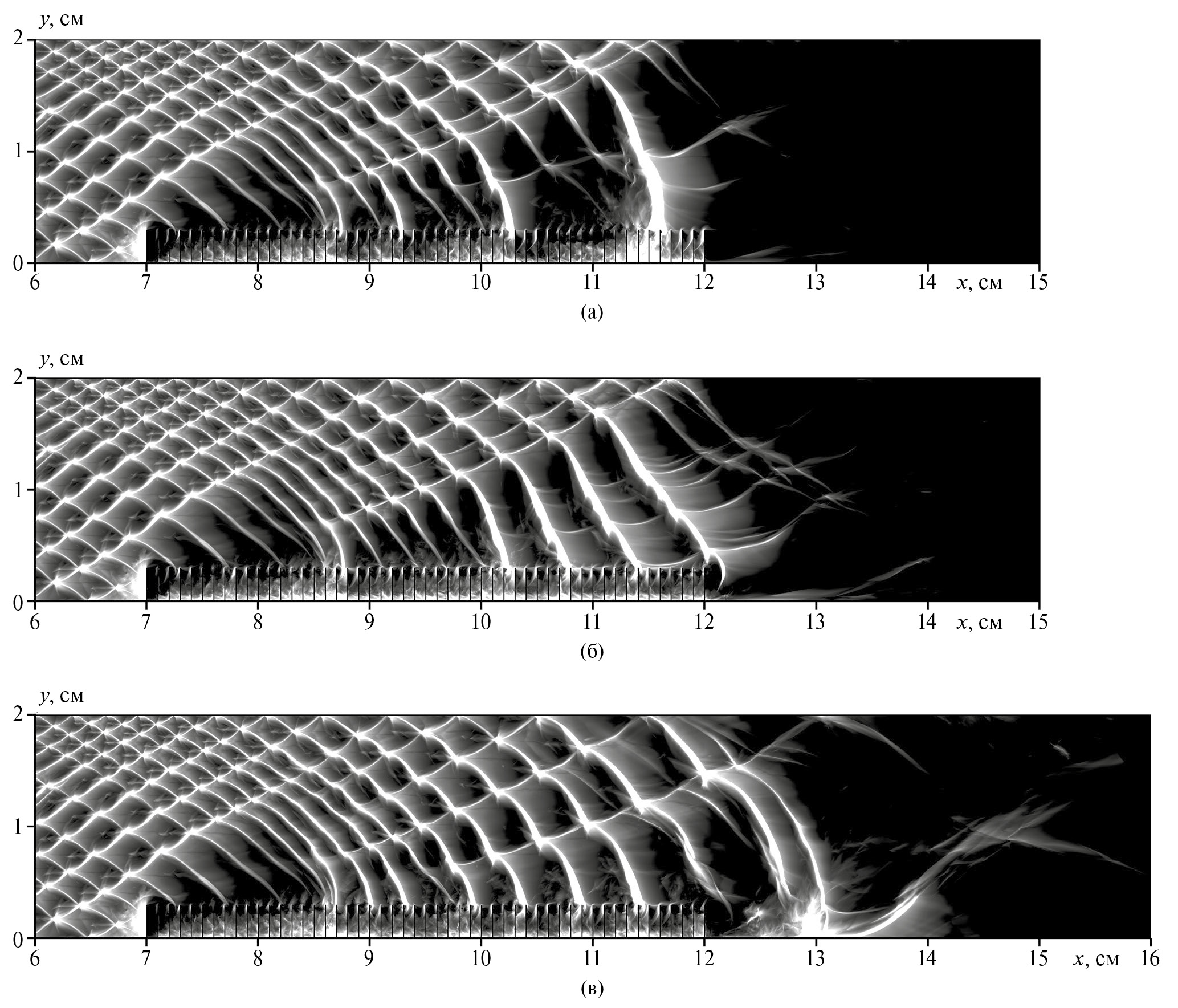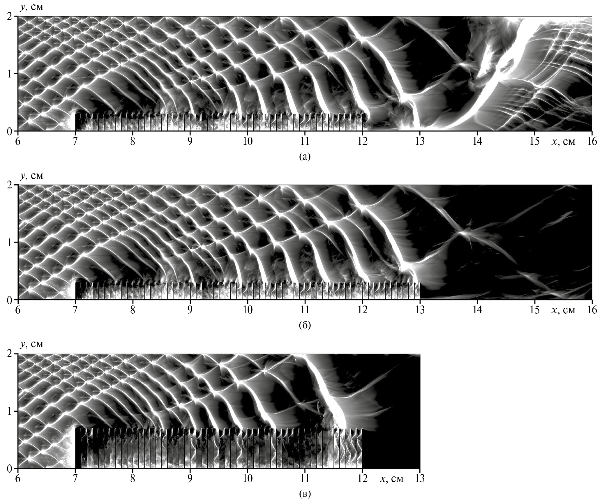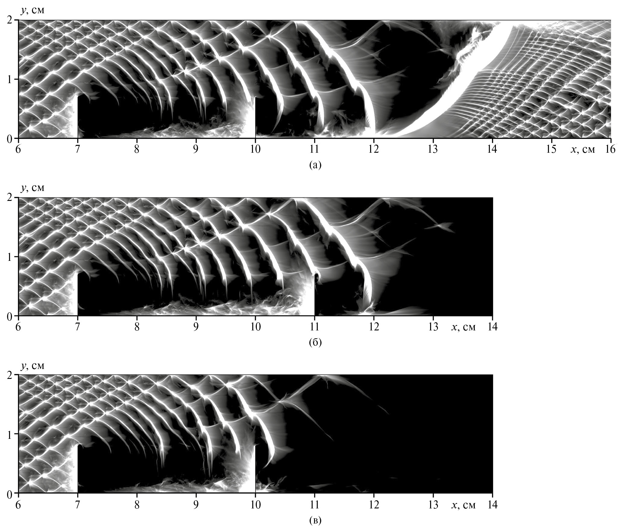 Однако расширение области до Lb = 6 см или увеличение высоты препятствий до Hb = 7 мм оказываются достаточными условиями для гашения детонационного горения барьерами (рис. 1б, в). На рис. 1 и далее представлены численные аналоги следа, оставляемого в эксперименте проходящей детонационной волной на расположенной вдоль стенки канала закопченной пластине.